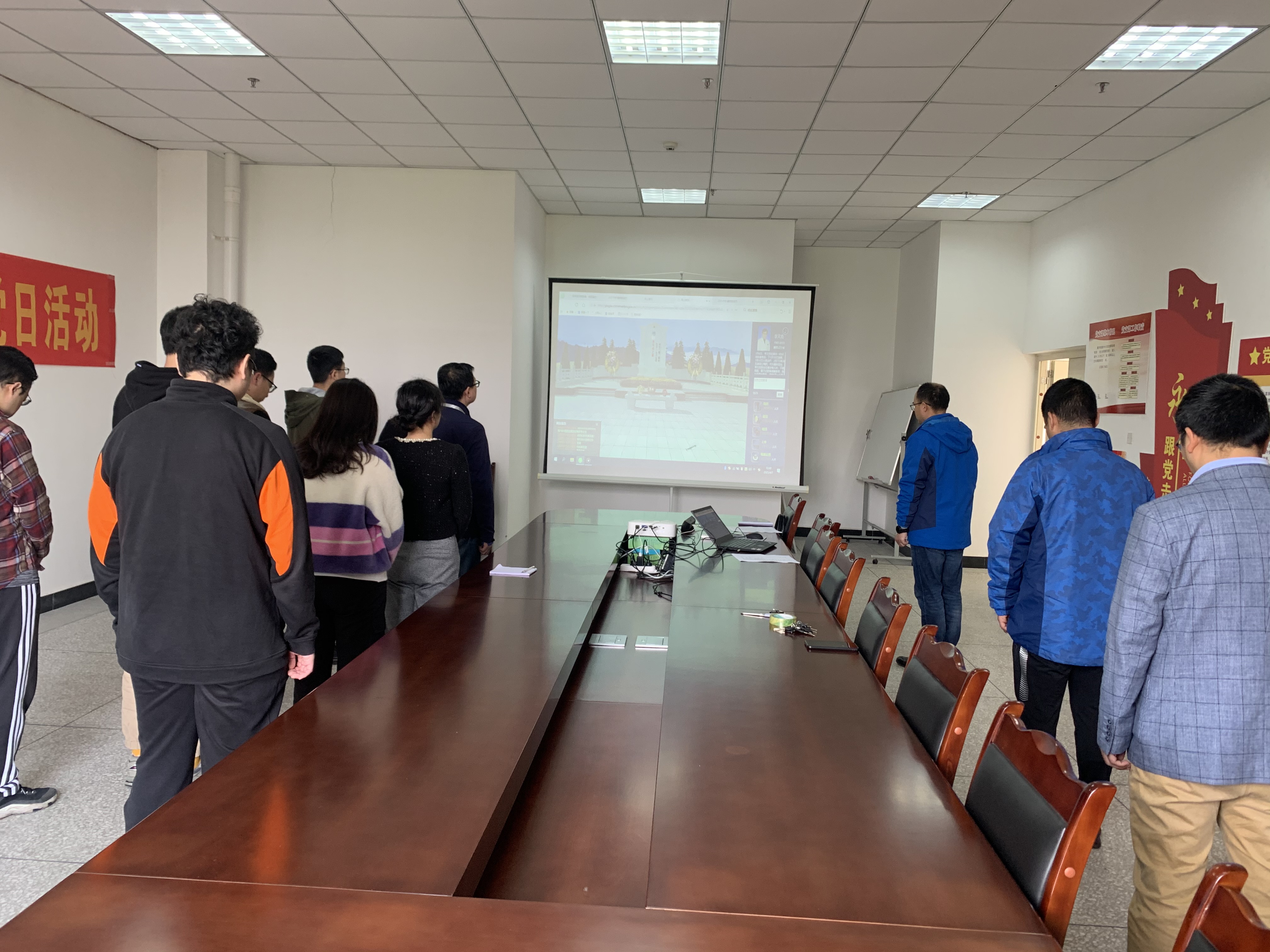 “起来,不愿做奴隶的人们,把我们的血肉,筑成我们新的长城......”伴随着一阵阵铿锵有力的歌声,图书信息中心党支部“清明祭英烈”主题活动开始了,通过奏唱中华人民共和国国歌唤起我们对国家的热爱及对民族的自豪感,回忆国家发展至今的艰苦历程,追思一代代为国牺牲的革命先驱。
