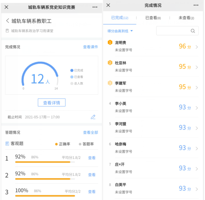 为庆祝中国共产党建党100周年,加强全体教职工对中国共产党的认识,城轨车辆系于2021年5月11日至2021年5月18日利用“雨课堂在线答题”的形式组织全体教职工参与党史知识竞赛。教职工们充分利用工作间隙,积极参与在线答题。 本次知识竞赛一共50道题,满分100分。竞赛题目有填空、单选题、判断题三类题型。竞赛题目内容丰富,覆盖了从“我国近代史的开端”到“新中国的成立”时期的党的重大历史事件,同时覆盖了从“枪杆子里面出政权”到“目前中国最高的国家级顶层战略”等党的理论知识。教职工们为了准确把握知识,线上百度、线下阅读,做足了功课,都取得了较高的得分。通过参加本次知识竞赛,教职工们进一步加深了对党史知识的掌握,进一步深化了对党的相关理论知识的理解。