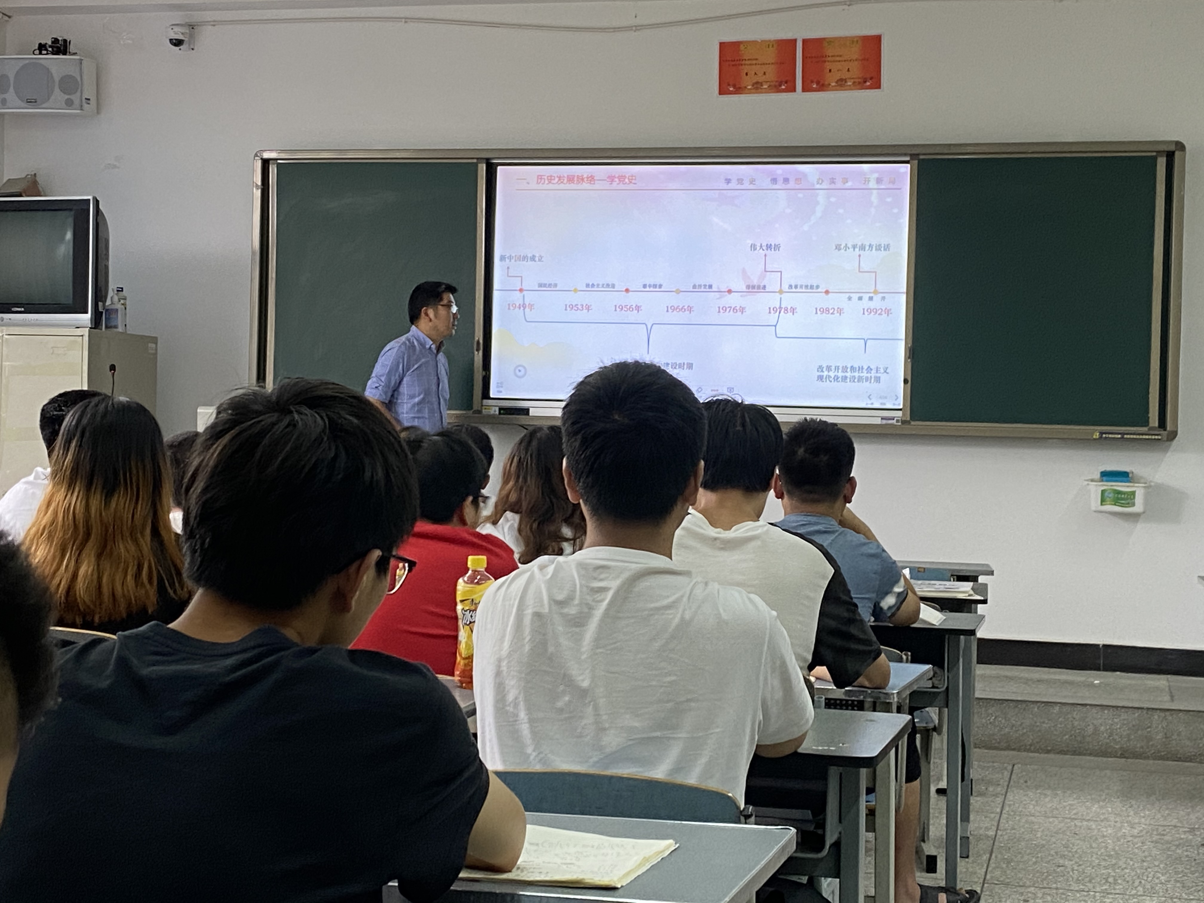 国无德不兴,人无德不立。习近平总书记强调:“要坚持把立德树人作为中心环节,把思想政治工作贯穿教育教学全过程,实现全程育人、全方位育人,努力开创我国高等教育事业发展新局面。”因此我们作为一线教育工作者更要在加强品德修养上下功夫,教育引导学生培育和践行社会主义核心价值观,踏踏实实修好品德,成为有大爱大德大情怀的人。 2021年6月3日,智能工程系主任杨凤,来到智能终端技术与应用20T1班,为同学们讲授了一堂别开生面的党课。杨主任此次党课的主题是“在探索中求发展 在改革中开新局”,首先杨主任为同学们梳理了我国社会主义改造时期和建设时期的历史重大事件和历史进程。了解我们党如何本着紧紧依靠人民,一起为了人民的总之,创造性地完成社会主义改造,在我国确立了社会主义基本制度;随后又带领人民发愤图强,掀起建设社会主义热潮,开始了沿着社会主义道路实现中华民族伟大复兴的历史征程。