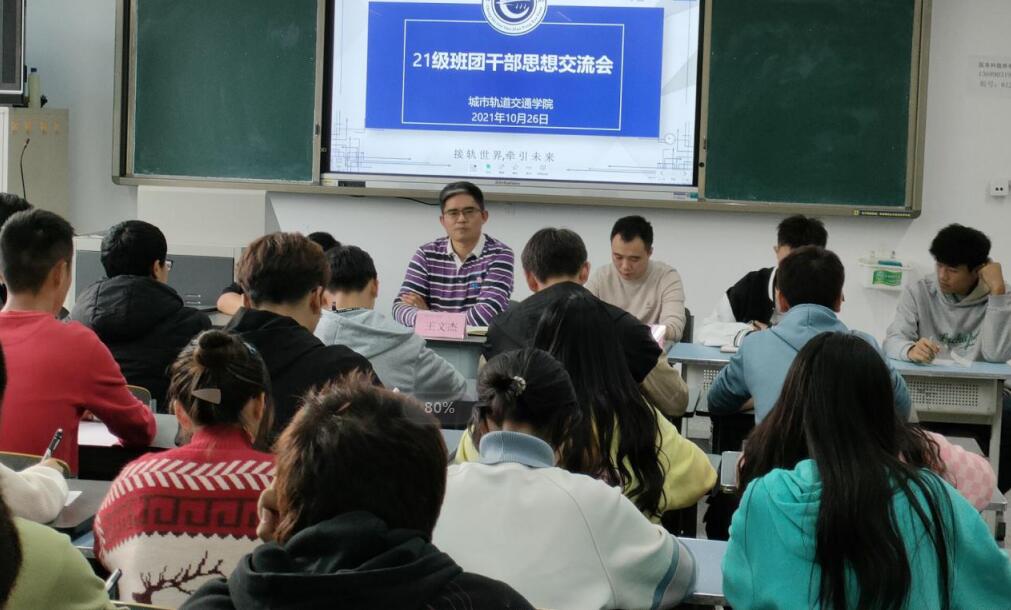 10月26日,城市轨道交通学院组织2021级新生班团干部在1311教室进行思想交流会。党总支书记王文杰主持会议。