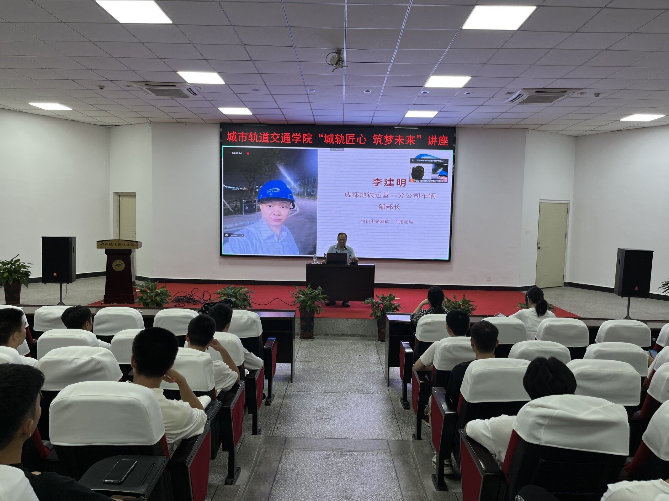 李建明部长详细介绍了成都轨道交通发展现状及检修岗位人才需求及要求,通过自身成长经历和优秀成才典型鼓励同学们不断提升自己、突破自己,他希望同学们养成良好的学习习惯、夯实知识技能,争做合格的检修人才。