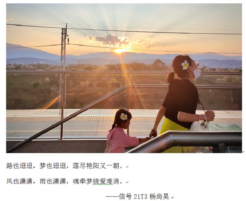 快乐减压,为心赋能,电信工程学院结合“5·25”全国大学生心理健康日开展“从今天开始,好好‘爱自己’”心理健康教育系列活动。本次系列活动由“情感留影,心灵之光”摄影大赛、“画我心情,心灵画卷”绘画活动、“精神之旅,悦享心灵”读书分享活动三个部分组成。 “情感留影,心灵之光”摄影大赛。活动旨在以摄影的形式,让同学们用镜头分享生活中美好的事物,并配以治愈心灵的文字,引导学生对生命意义和人生价值等进行思考和探索,弘扬正能量,让大学生更加关注自己内心。摄影活动收到近百份参赛作品,来自信号21T3班的杨尚昊同学说:“对于生活,我一直保持着乐观的态度,在西双版纳的火车站,我拍出这幅落日余晖中格外耀眼的生活小幸福。”