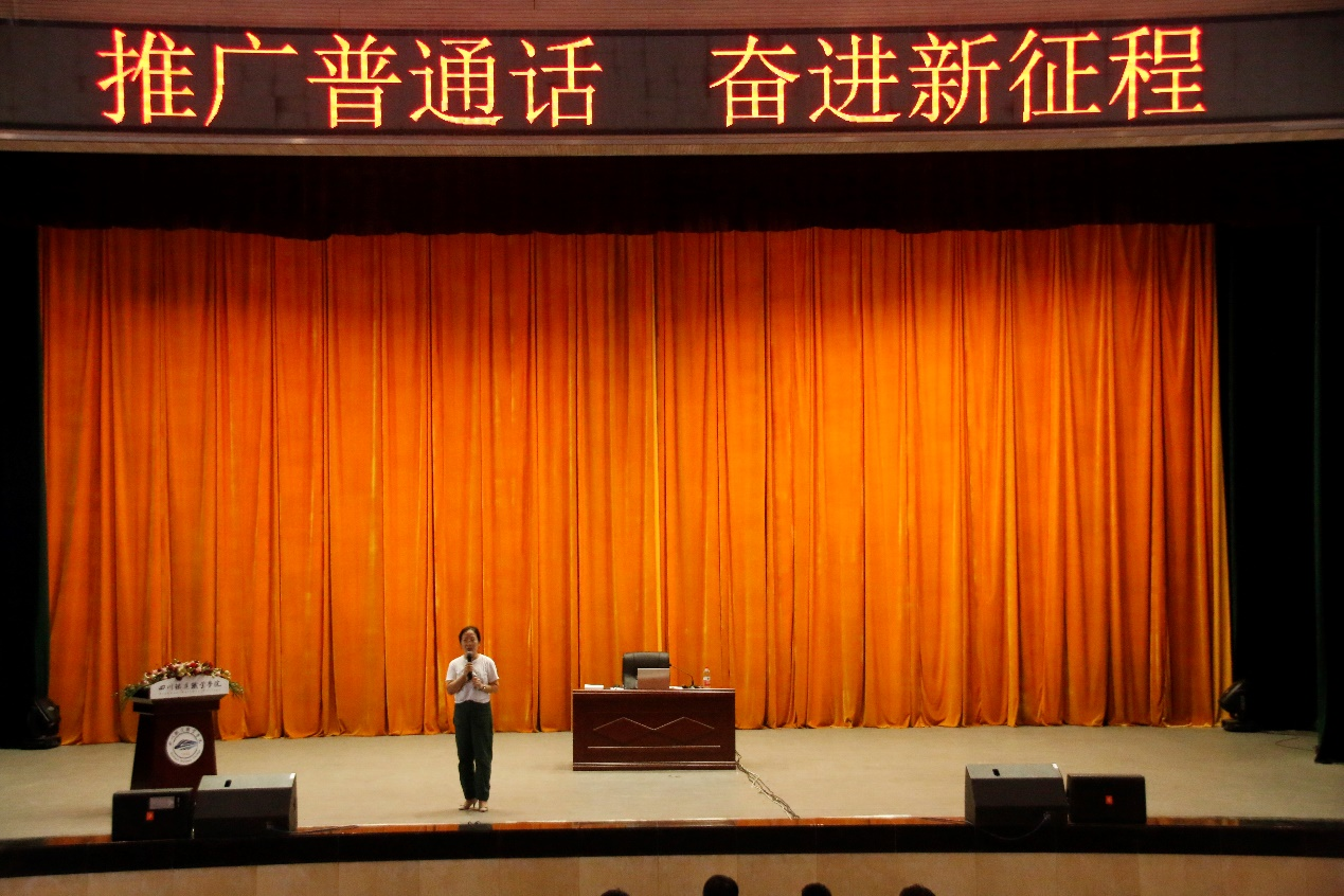 颜静首先以生动的视频切入,唤起大家对生活中语言文字运用的思考和讨论;接着进入主题,一是介绍普通话的发展和立法过程,让大家对普通话在增进文化认同方面的作用有了深刻认识;二是解读了普通话测试中的考点变化,鼓励同学们细心准备,认真备考;三是通过四川方言与普通话之间的对比,让同学们在笑声中认识到了生活中正确运用普通话的重要性;四是鼓励大家争做推广普通话的践行者和宣传员。