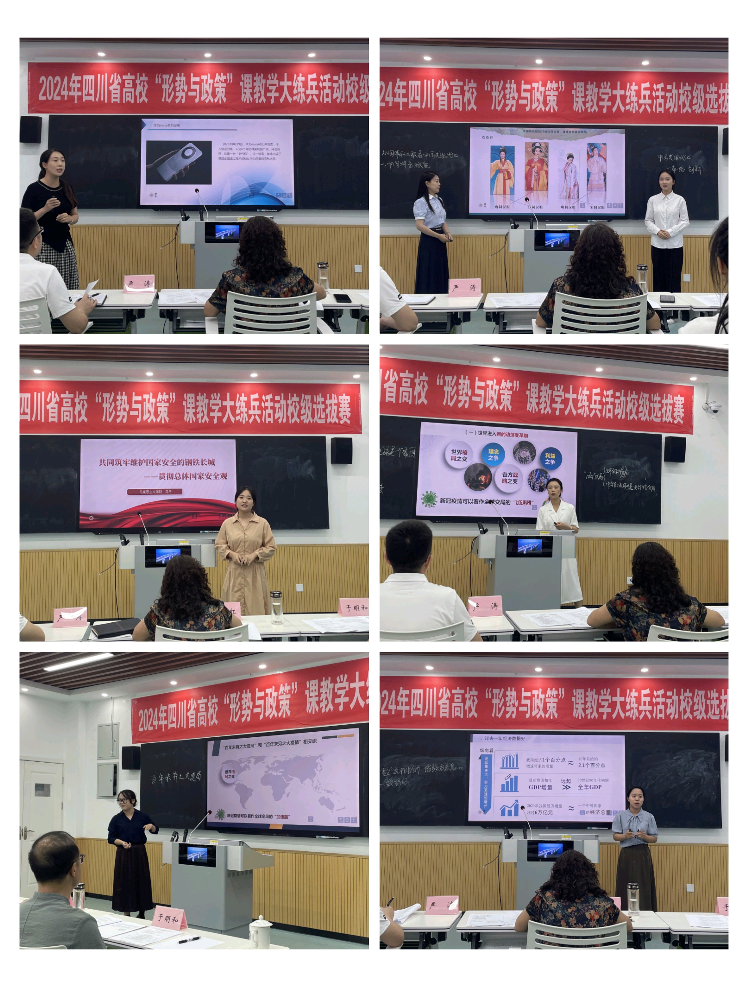 为深入学习贯彻落实习近平总书记对学校思政课建设的重要指示精神,进一步提高beat365“形势与政策”课教师教学能力和水平。根据beat365英国官方网站《关于组织2024年四川省高校“形势与政策”课教学大练兵活动校级选拔赛的通知》要求,beat3652024年四川省高校“形势与政策”课教学大练兵活动校级选拔赛于7月5日下午在2302智慧教室如期举行。入围校级选拔赛的6名专兼职教师参加了此次比赛,全体思政课教师到现场学习观摩。马克思主义学院院长朱红,副院长严涛,毛泽东思想和中国特色社会主义理论体系概论教研室主任于明和、形势与政策教研室主任王婷婷(线上)担任评委。 6位参赛教师精心准备,全情投入,分别以“百年未有之大变局背景下的国际形势”“共同筑牢维护国家安全的钢铁长城”“世界科技竞争日趋激烈”“从国潮汉服看中国式现代化”“人类是一个整体 地球是一个家园”“数说中国经济 增强发展信心”为题进行了教学展示。展示教师紧扣教学重难点,用最新的数据、鲜活的案例、严谨的逻辑、流畅的语言,将最新时政讲深讲透,展现了beat365教师的教学风采。 经过激烈角逐,综合教学设计方案和现场课堂教学展示效果,经评委打分,马丹获一等奖并代表beat365参加省级比赛,陈钰获二等奖,龚雪晖、张汇蓉获三等奖。