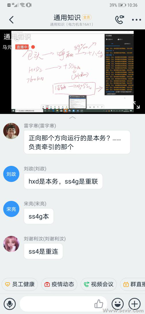 马元老师通过钉钉向机车16A1班级的学生进行《机车乘务员通用知识》授课。