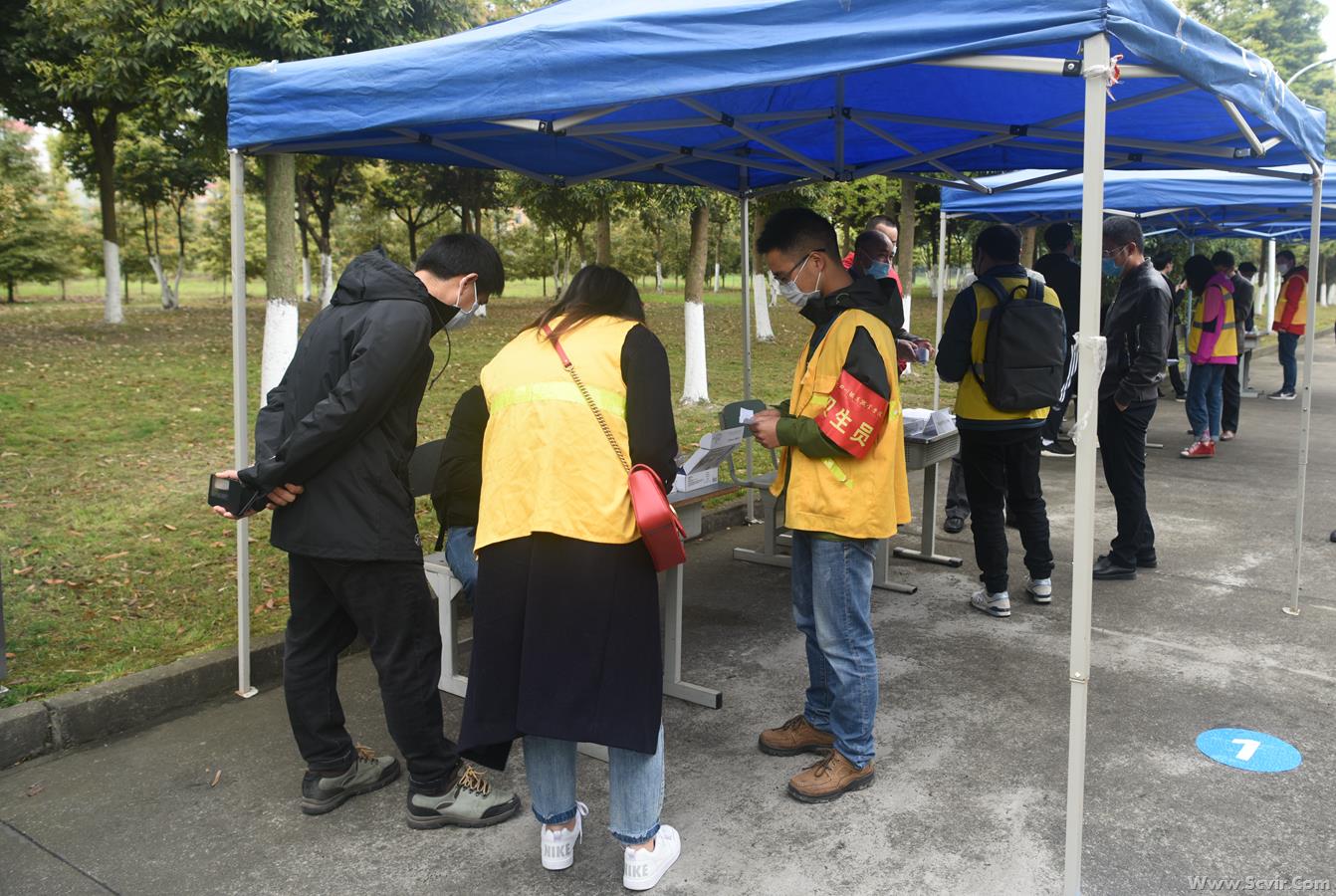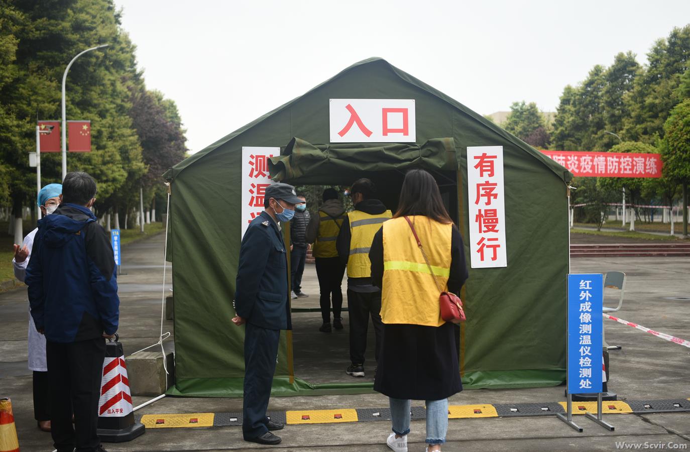演练正式开始: 一、严把入口,做好入校管控 1.人员车辆引导。学生搭乘的车辆即停即走,工作人员维护校门外交通秩序,学生佩戴口罩进入指定通道。 2. 体温监测。学生在指定通道接受红外成像测温,体温检测合格(37.3℃以下)进入报到程序。 3. 学生核验身份及报到。学生到相应类别报到通道有序排队(保持1米以上的间距),报到时由班主任对本班学生进行逐一核验身份并报到、用额温枪检测体温,在《学生返校信息登记表》(电子或纸质)中记录入校时间及体温,确认正常后出具《报到完毕、准予入校》单,经安保人员复验后进入校园。