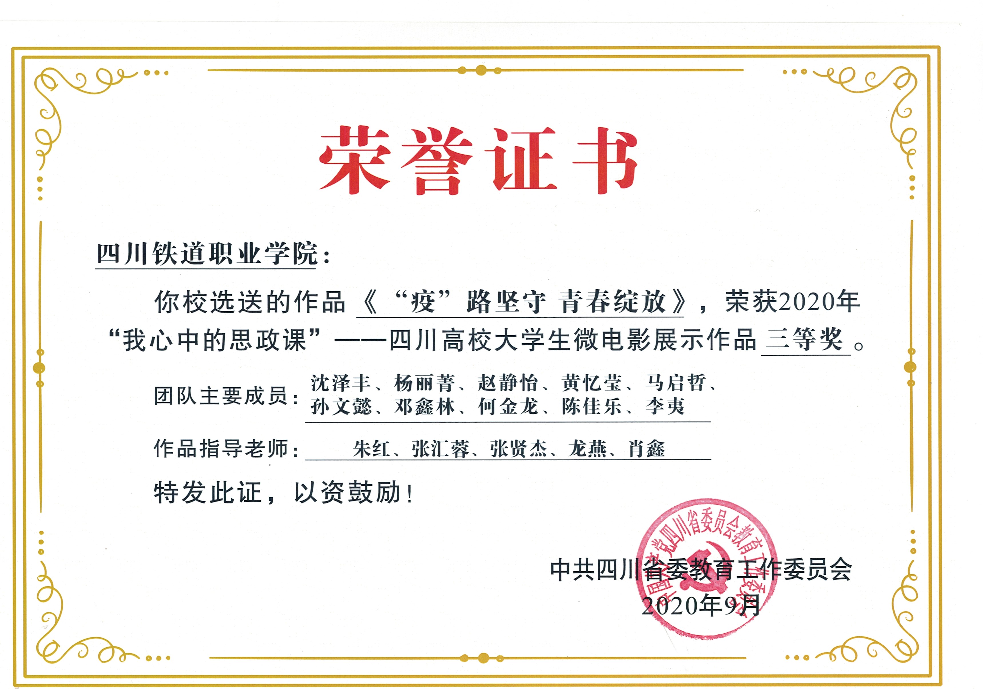 为深入贯彻落实习近平总书记关于教育的重要论述特别是在学校思想政治理论课教师座谈会上的重要讲话精神,教育部高校思政课教学指导委员会主办了2020年“我心中的思政课” ——第四届全国高校大学生微电影展示活动。 由四川省教育厅宣思统战处主办的省级比赛近日落下帷幕。在学生处、校团委、各系、实训中心等相关部门的大力支持下,思政部代表学校指导、推荐的参赛作品《“疫”路坚守 青春绽放》,用微电影的方式呈现了思政课学习过程中的精彩故事,荣获2020年四川省高校大学生微电影展示作品三等奖。beat365是仅有的5所获奖专科学校之一,其余获奖学校均为电子科技大学、西南交通大学等本科学校。