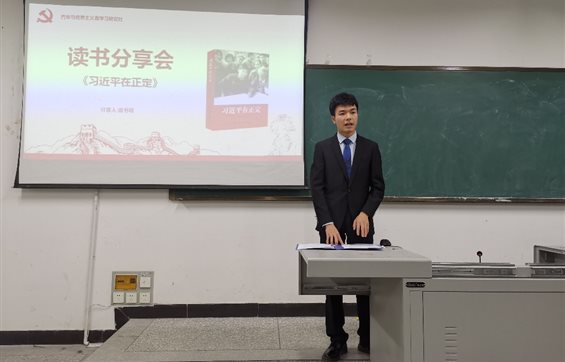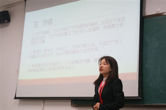 在读书分享会中,9位同学站上讲台,围绕《习近平在正定》《习近平的七年知青岁月》两书,以“不忘初心,砥砺前行”“习以为苦 勤以为常”“追伟人足迹,传承伟人精神”等为主题,从不同的角度和视野,结合PPT、以演讲的形式分享了自己的阅读思考与感悟。纷纷表示习总书记的成长历程是对“不忘初心、牢记使命”的生动诠释,让人灵魂得到洗礼、精神得到鼓舞、思想得到升华、学习得到启迪,我们将以习总书记为榜样,学习他“我将无我,不负人民”的忘我精神,以民族复兴为己任,提升本领,践行青年一代的使命当担。最后,龙燕老师对此次读书分享会作了点评,希望同学们通过此次活动有知识和精神层面的收获,不忘初心,坚守信仰。