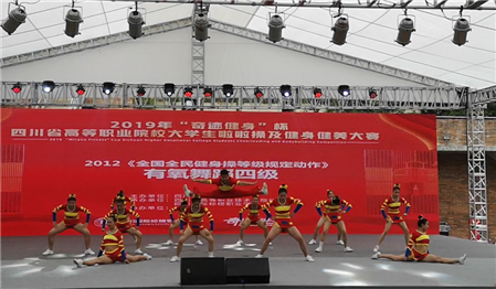 2019年11月16日,四川省高等职业院校大学生啦啦操及健身健美大赛在四川国际标榜职业学院拉开帷幕,来自全省25所高职院校代表队盛装参赛。我院由交通工程系、电气系、电信系、机车系、管理系、会金系的18名同学组成的啦啦操队代表队以健美操规定套路有氧舞蹈四级参赛,最终以团体总分8.5分的成绩获得二等奖。