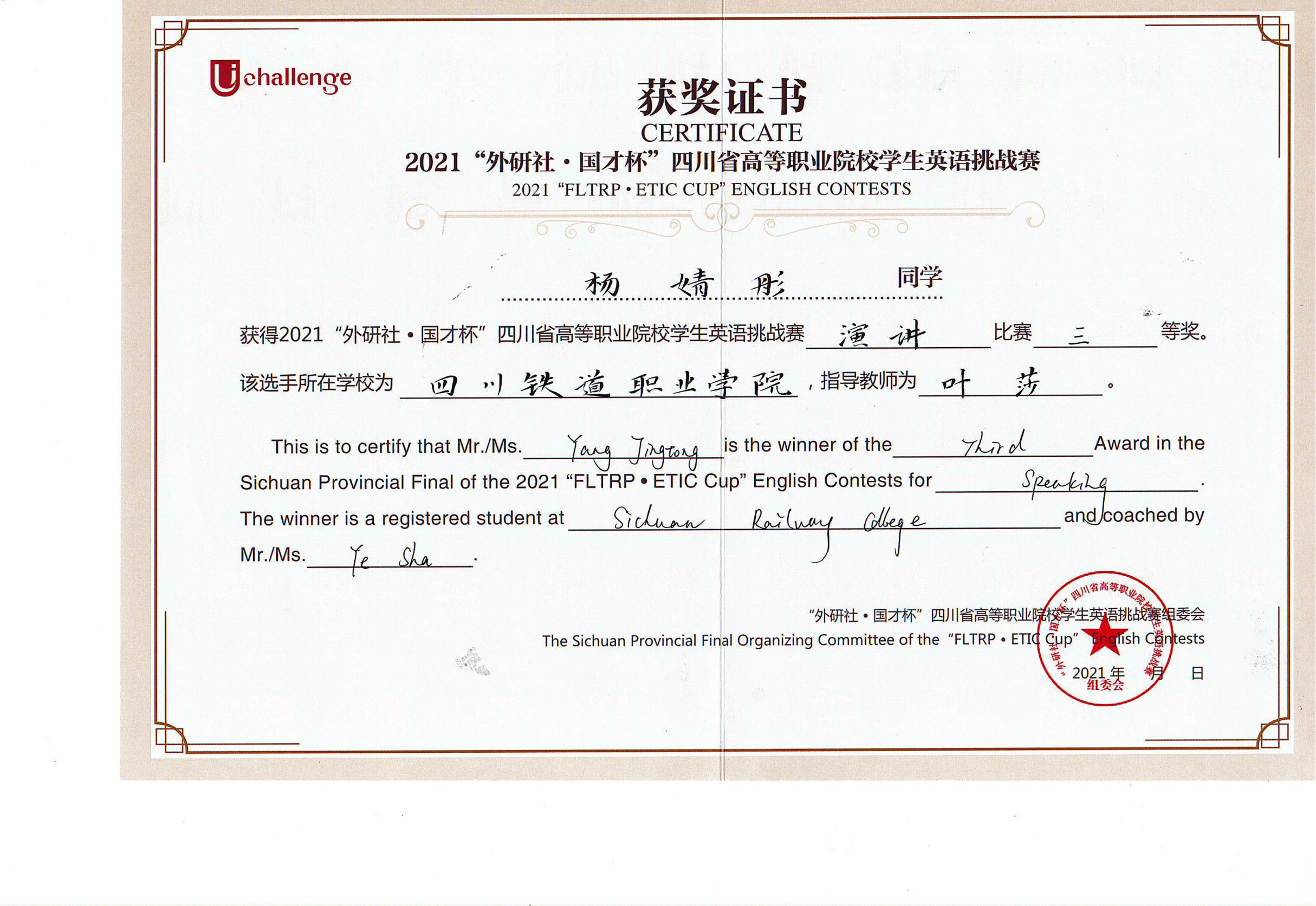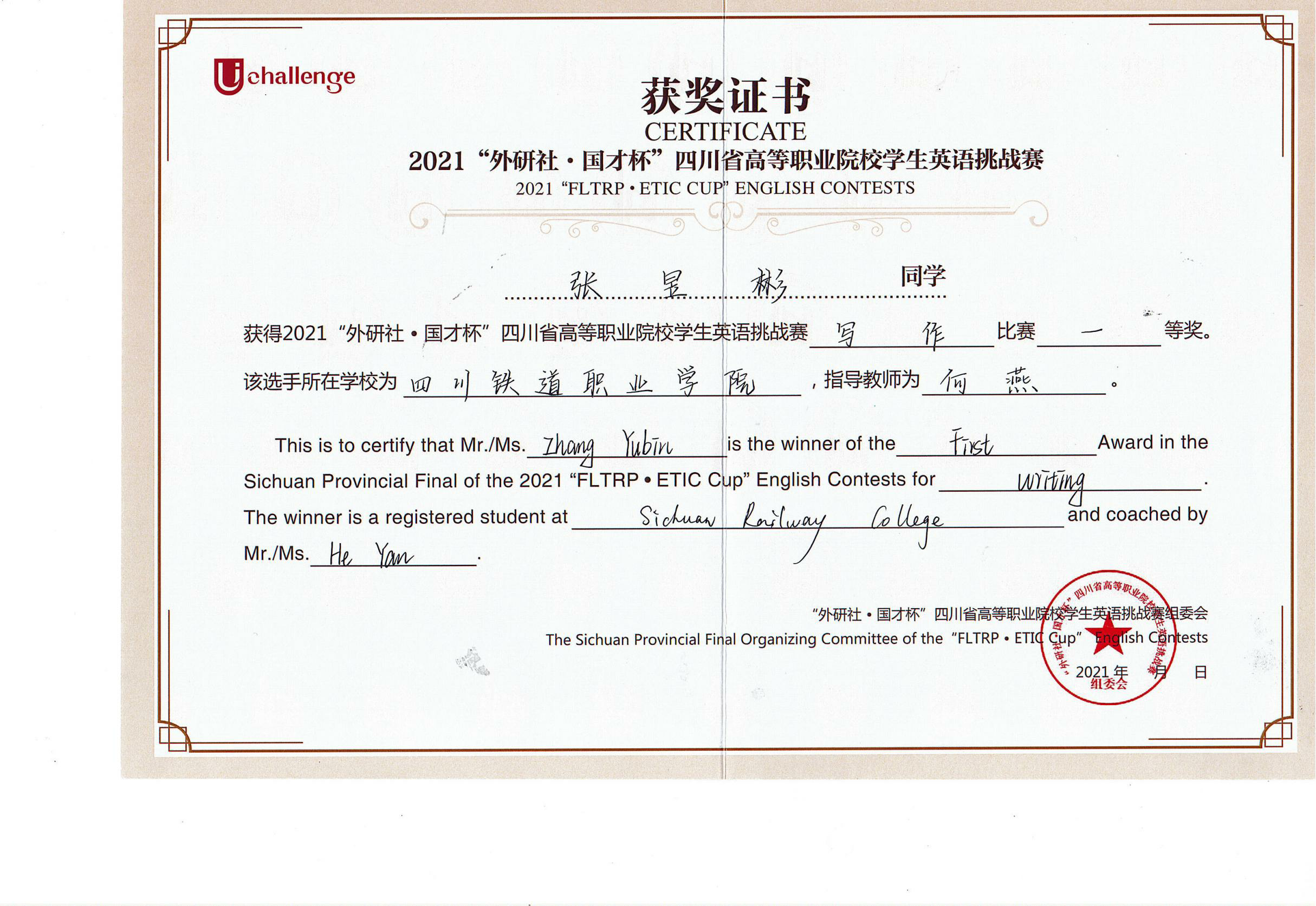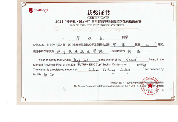 2021年10月30日至31日,由四川省教育厅主办,四川文化产业职业学院、外语教学与研究出版社承办的2021年UChallenge四川省高等职业院校学生英语挑战赛在四川文化产业职业学院隆重举行。经过激烈角逐,beat365铁道机车运用与维护21T1张昱彬获得写作大赛一等奖,铁道信号自动控制21T1蒋林杞获得写作大赛二等奖,铁道信号18A1杨婧彤获得演讲比赛三等奖。 本次大赛汇聚了四川省63所高等职业院校的209名选手参加比赛,由英语演讲和英语写作两项赛事组成,以高远的立意和创新的理念,全面提升高职学生的英语综合应用能力。赛前,公共教学部英语教研室何燕、叶莎两位老师分别作为写作指导教师和演讲指导教师,对选拔出的参赛选手进行了专业而细致的指导培训,积极做好竞赛的筹备工作。比赛过程中,beat365学生凭着扎实的英文基础和坚持不懈的刻苦训练,以出色的文笔、清晰的逻辑和流利的表达获得优异成绩。 此次比赛,促进了beat365与其他高职院校之间的交流,展现了beat365学生的风采,为全校英语教学增添了丰富的形式。以赛促教、以赛促改,拓宽了教学改革渠道,提高了英语教学工作质量,促进了复合型技术技能人才的培养。 张昱彬(右三)荣获写作一等奖 蒋林杞(正中间)荣获写作二等奖 杨婧彤(正中间)荣获演讲三等奖 |