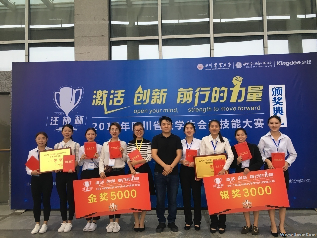 2017年9月22日,我院会计金融系代表队“天地一队”、“宇宙一队”参加了由四川省教育厅主办,四川农业大学承办,四川省注册会计师协会、金蝶软件(中国)有限公司成都分公司协办的2017年“注协杯”四川省大学生会计技能大赛。经过激烈角逐,我院会计金融系祝瑾老师指导的“天地一队”(队员:文璟、卢曦、吴庆玲、程冰瑶)和廖星煜老师指导的“宇宙一队”(队员:张梦丹、王茜、李炳杉、尹钏蓉),不负众望,分别夺得专科组第一名、第二名的佳绩,斩获一等奖金奖、一等奖银奖。