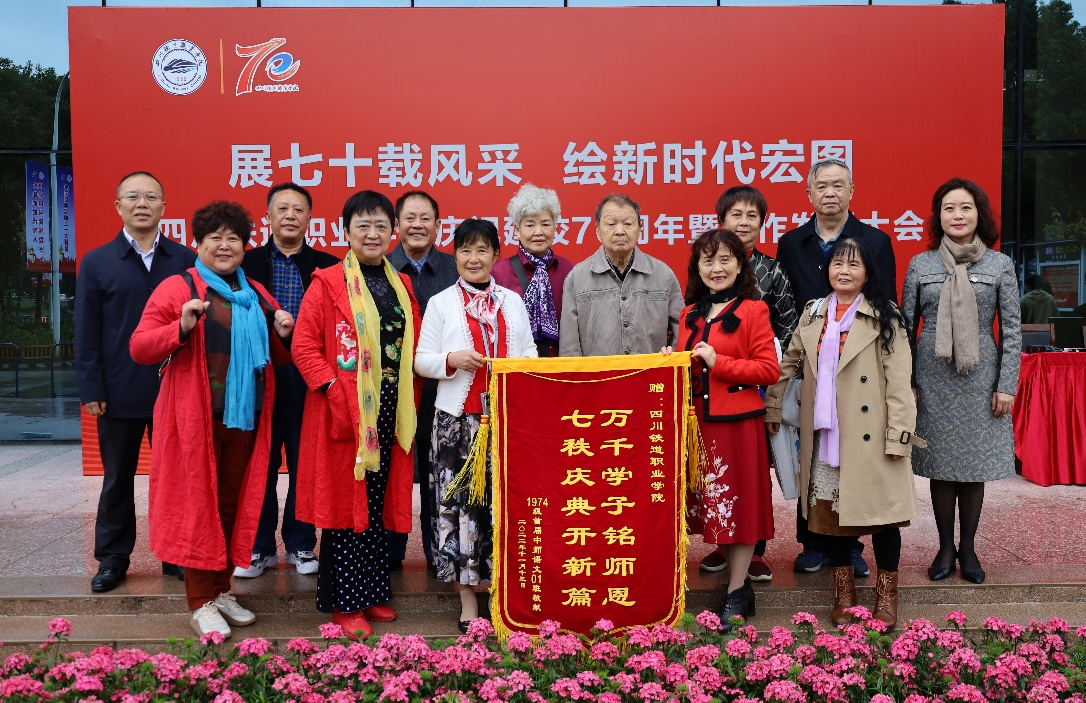 中师语文1班返校校友还代表班级全体同学,向母校赠送了“七秩庆典开新篇  万千学子铭师恩”的锦旗。