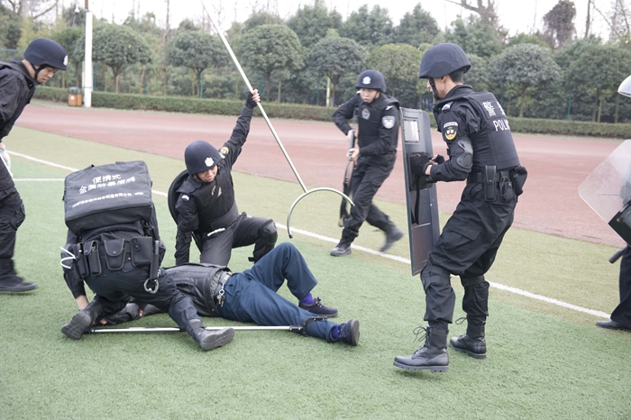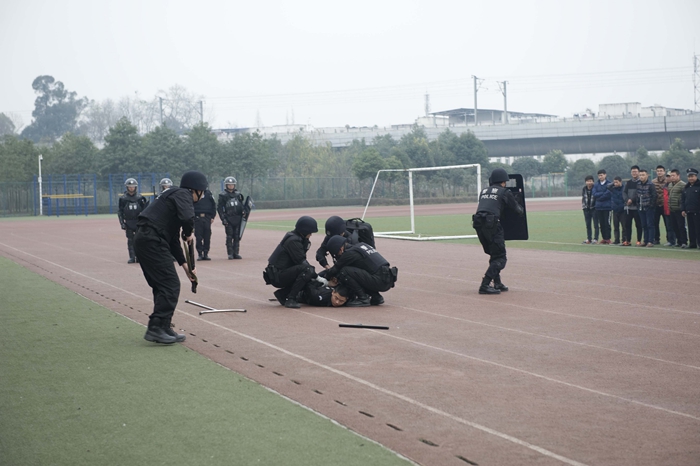 为了进一步加强校园安全,提升师生应对恐怖袭击的应变能力和协调配合能力,2016年12月28日,我院邀请郫县公安局国保大队副大队长周鸣飞警官到校,开展反恐防暴安全专题讲座和应急实战演练。本次活动得到了郫县公安局国保大队、刑警大队、安德派出所等单位和全院各系部的鼎力支持,共有1200余人参加。 专题讲座中,周鸣飞副大队长介绍并分析了反恐防暴的形成背景和当前形势,暴力恐怖势力、民族分裂势力、宗教极端势力的活动趋势,国际国内安全形势以及《反恐怖主义法》的背景、架构、安全防范、情报信息、应对处置、保障措施等内容。 随后,在学院运动场进行了反恐防爆处突应急实战演练。演练过程为:模拟两名恐怖分子进入校园,挥刀砍伤值班保安和学生。保安立即向安德派出所和学院安全保卫处报警,接警后立即启动防暴处突应急预案,安保人员、刑警赶至现场,手持反恐器械将两名恐怖分子合围并抓获。模拟演练结束后,郫县公安局刑警大队还进行了反恐防暴器械演示演练。 此次活动,提高了师生的安全保护意识,增强了师生的紧急避险和自救互救能力,有利于保障校园的安全稳定和师生的人身安全。