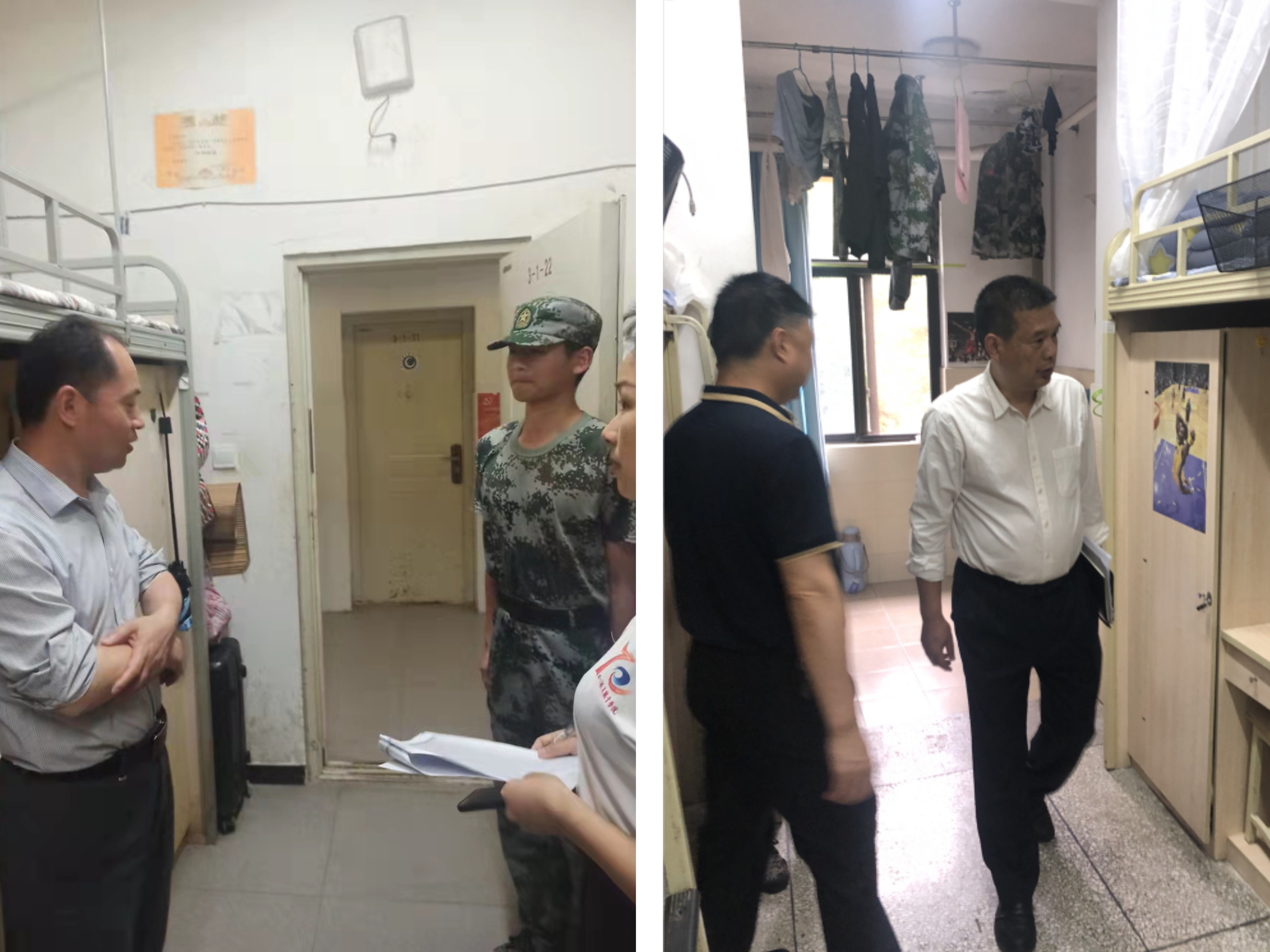在消防安全检查中,各二级学院组织辅导员和军训教官对2022级全体学生寝室进行了消防安全检查,重点检查私拉乱接和大功率电器。刘昊君和黄勇分别带领学生处和安全保卫处相关人员对学生寝室消防安全进行了抽查,没有发现违规行为。 下午四点,学校开展消防安全应急疏散演练。演练以4号学生公寓发生火情为背景,由点燃烟雾弹、拉响消防警报、组织人员疏散、清点人数和演练总结等环节组成。消防警报响起时,参加演习的全体老师和军训教官迅速到达指定位置,组织学生按照疏散路线有序撤离至田径运动场集合,各二级学院立即组织清点人数,并向现场指挥报告。
