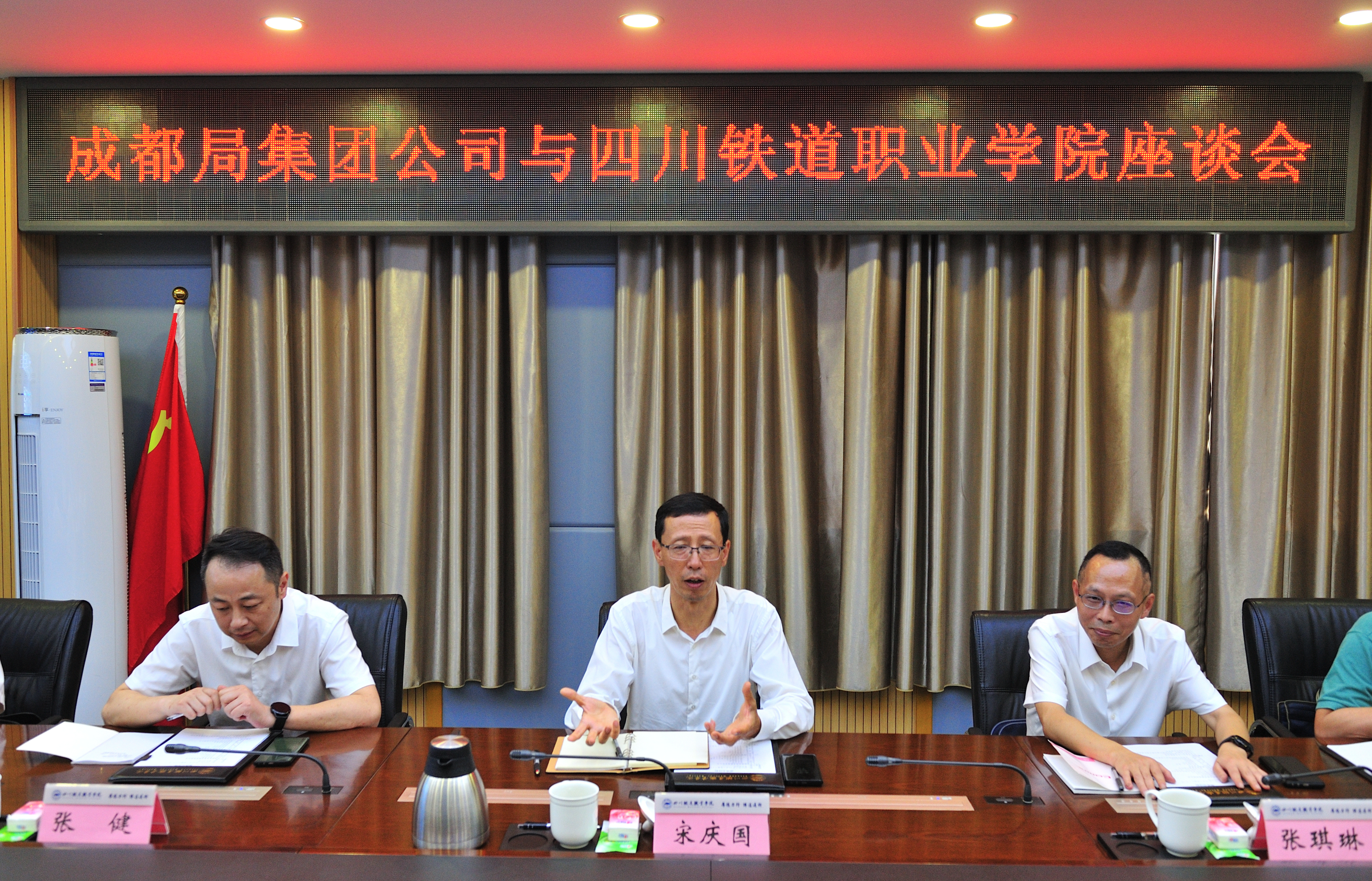 7月19日下午,中国铁路成都局集团有限公司副总经理宋庆国、职培部主任张琪琳、劳卫部副主任张健、职工培训基地成都培训部部长陈小春、人才交流培训站二室主任卿少兴、职培部职教科副科长王梦滔、劳卫部劳动组织科副科长王凤一行来校调研指导工作,在校企合作、产教融合、学生就业等方面进行了深入交流。学校党委书记贺兆轩,校长赖芳,党委副书记刘昊君,副校长黄勇、黄恩兴及相关部门负责人参加座谈会。