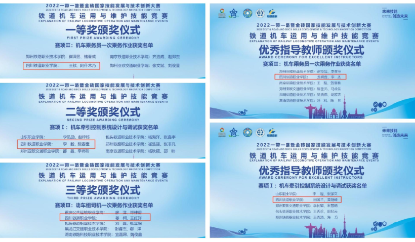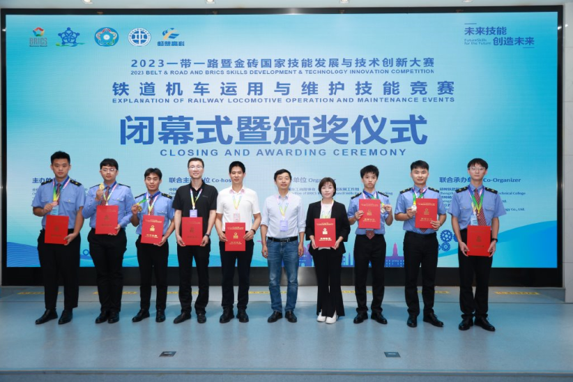 9月15日至17日,2023年一带一路暨金砖国家技能发展与技术创新大赛“铁道机车运用与维护”赛项在郑州铁路职业技术学院举行。竞赛分为三个子赛项,beat365铁道机车运用与维护专业21级学子王钦、阿什木乃(彝族)(指导教师龙明贵、李杰)在赛项2机车乘务员一次乘务作业赛项中斩获一等奖;李毅、阮春宝(彝族)在赛项1机车牵引控制系统设计与调试赛项(指导教师田国兰、黄翎峰)荣获二等奖;姜柯、王红洋(指导教师邓勇、罗林顺)在赛项3动车组司机一次乘务作业赛项荣获三等奖。龙明贵、李杰、田国兰、黄翎峰四名教师荣获优秀指导教师奖。 本次大赛由金砖国家工商理事会中方理事会、一带一路暨金砖国家技能发展国际联盟、中国发明协会、教育部中外人文交流中心联合主办,郑州铁路职业技术学院、郑州畅想高科股份有限公司联合承办。全国28个省市的38所职业院校和埃塞俄比亚、吉布提、老挝、蒙古国等均派有代表队参赛。 本次竞赛促进了beat365与其他职业院之间的友好交流,充分展示了近些年beat365铁道机车运用与维护专业教学改革和实践成果,激发学生学技术、比技能、勇于拼搏的精神,营造尊重劳动、尊重知识、尊重技术、崇尚技能的学习风气,弘扬新时代劳模精神和工匠精神,为川藏铁路和成渝双城经济圈建设提供高素质现代化动车驾驶和机车驾驶人才培养提供了有力支撑。
