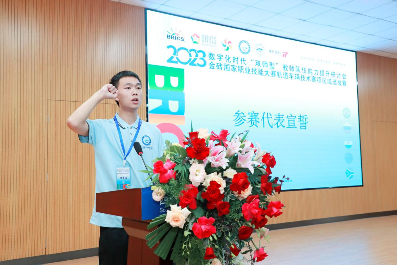 参赛选手代表宣誓 在热烈的掌声中,刘昊君宣布2023金砖国家职业技能大赛轨道车辆技术赛项区域选拔赛正式开幕。