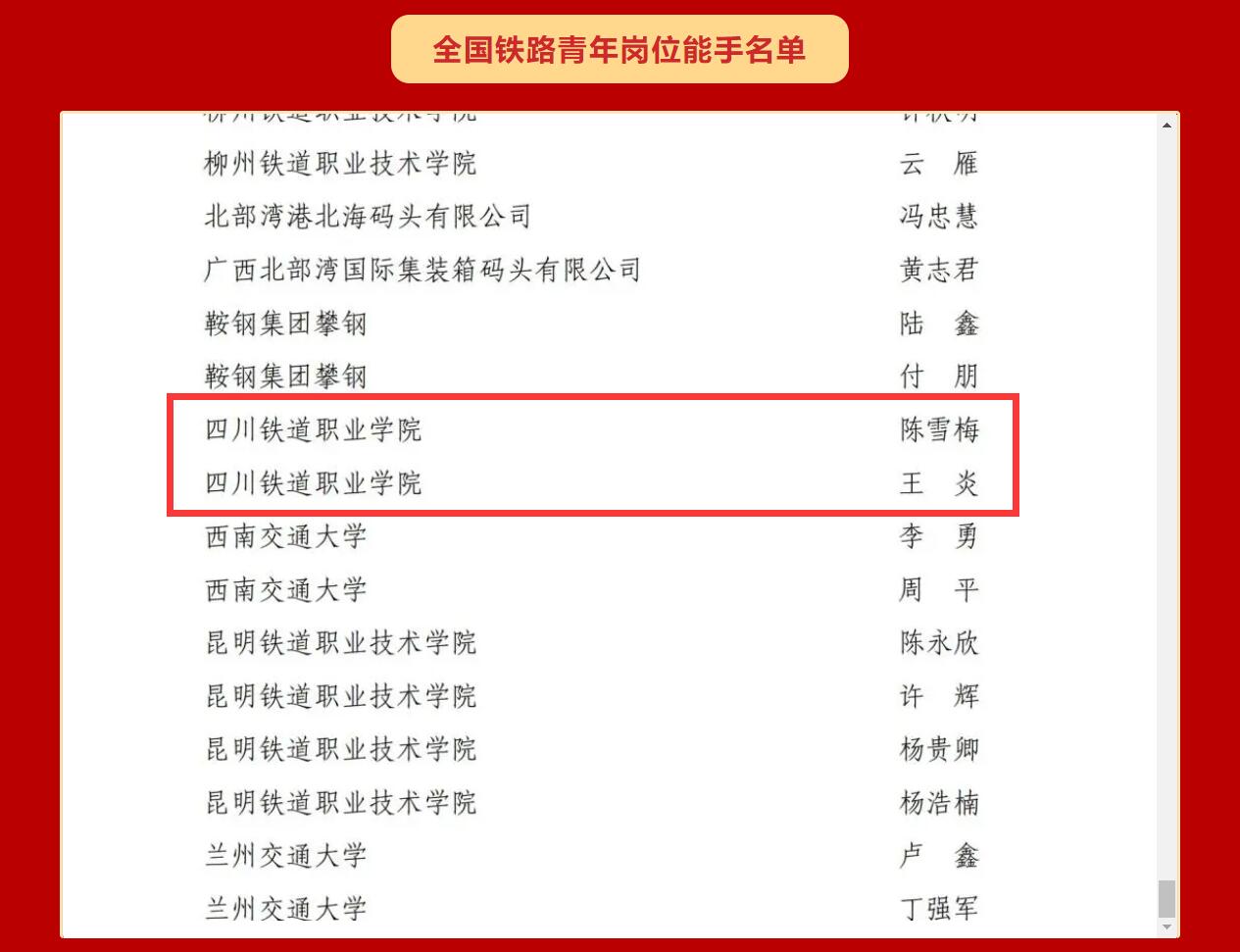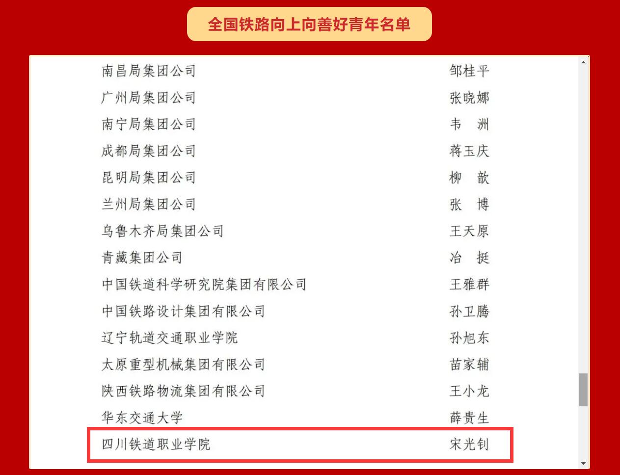4月9日,全国铁道团委公布了2023年度全路“双创立功”竞赛、青年岗位能手、向上向善好青年评选结果,beat365“铁小川”志愿服务团队获评“全国铁路青年安全生产示范岗”,陈雪梅、王炎同学被授予“全国铁路青年岗位能手”称号,冉冉、宋光钊同学被授予“全国铁路向上向善好青年”称号。