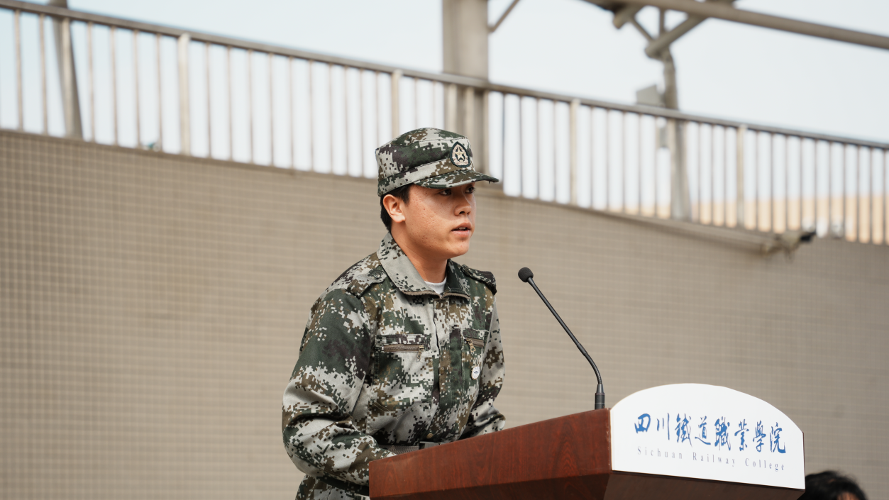 军训标兵代表李永涛发言,回顾了14天军训中在炎炎烈日下站军姿、练队列,在大雨滂沱时整内务、勤学习,升华了爱国爱军情感,培养了艰苦奋斗、吃苦耐劳的良好品质。李永涛向全体新生发出倡议,要将军训中养成的好品德、好习惯、好作风带到今后的学习生活中,涵养“军人气质、大师素质”,砥砺“厚德力行、博道通术”校训精神,书写青春无悔篇章。