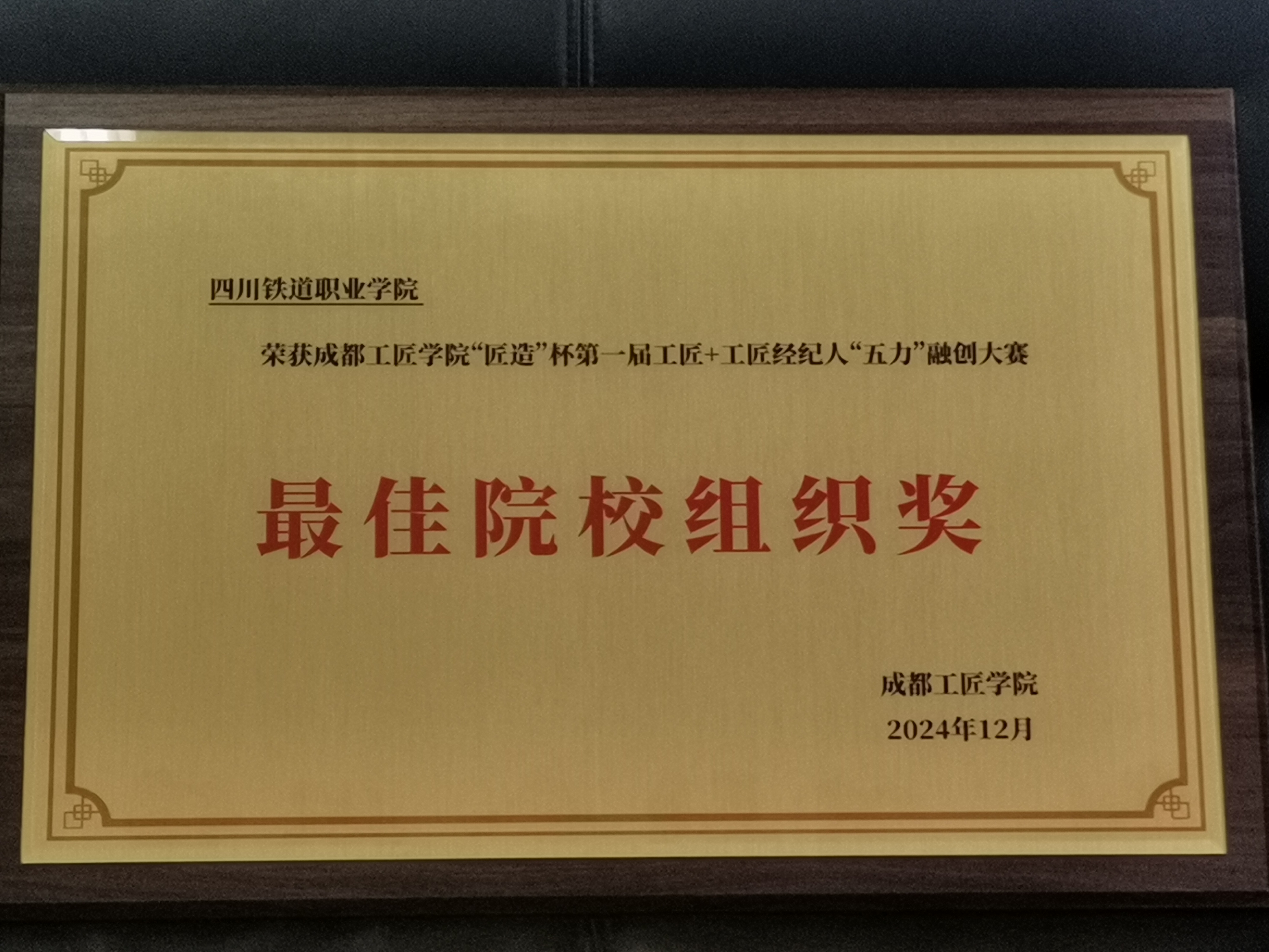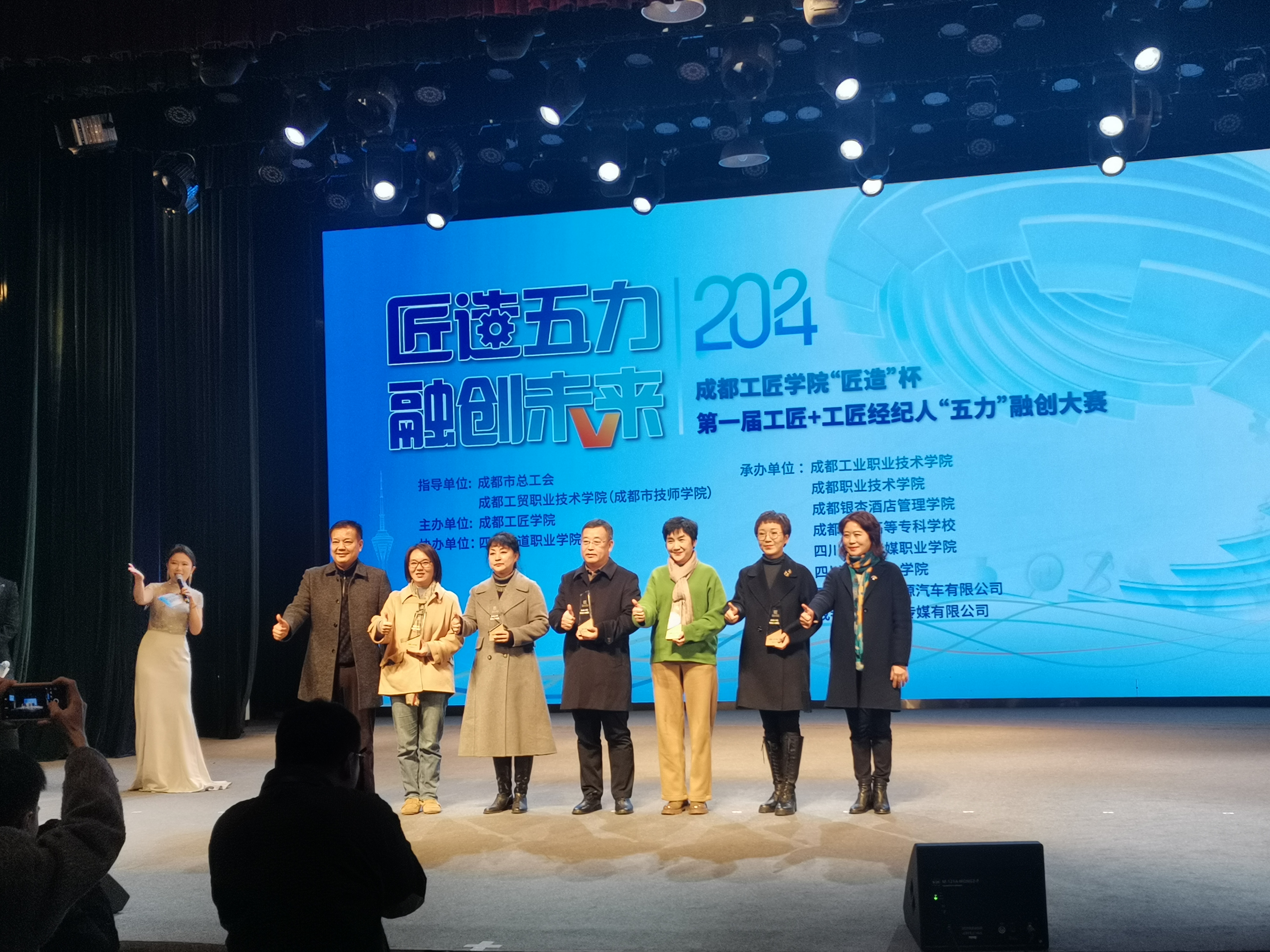 2024年12月27日下午,成都工匠学院“匠造”杯第一届工匠+工匠经纪人“五力” 融创大赛闭幕式在成都市劳动人民文化宫梦想剧场隆重举行。成都市总工会党组成员、副主席方启军以及相关单位院校负责人、工匠代表、企业代表及参赛师生团队出席出席活动。学校党委副书记、校长赖芳应邀出席并为获得“杰出工匠经纪人团队”颁发奖杯。