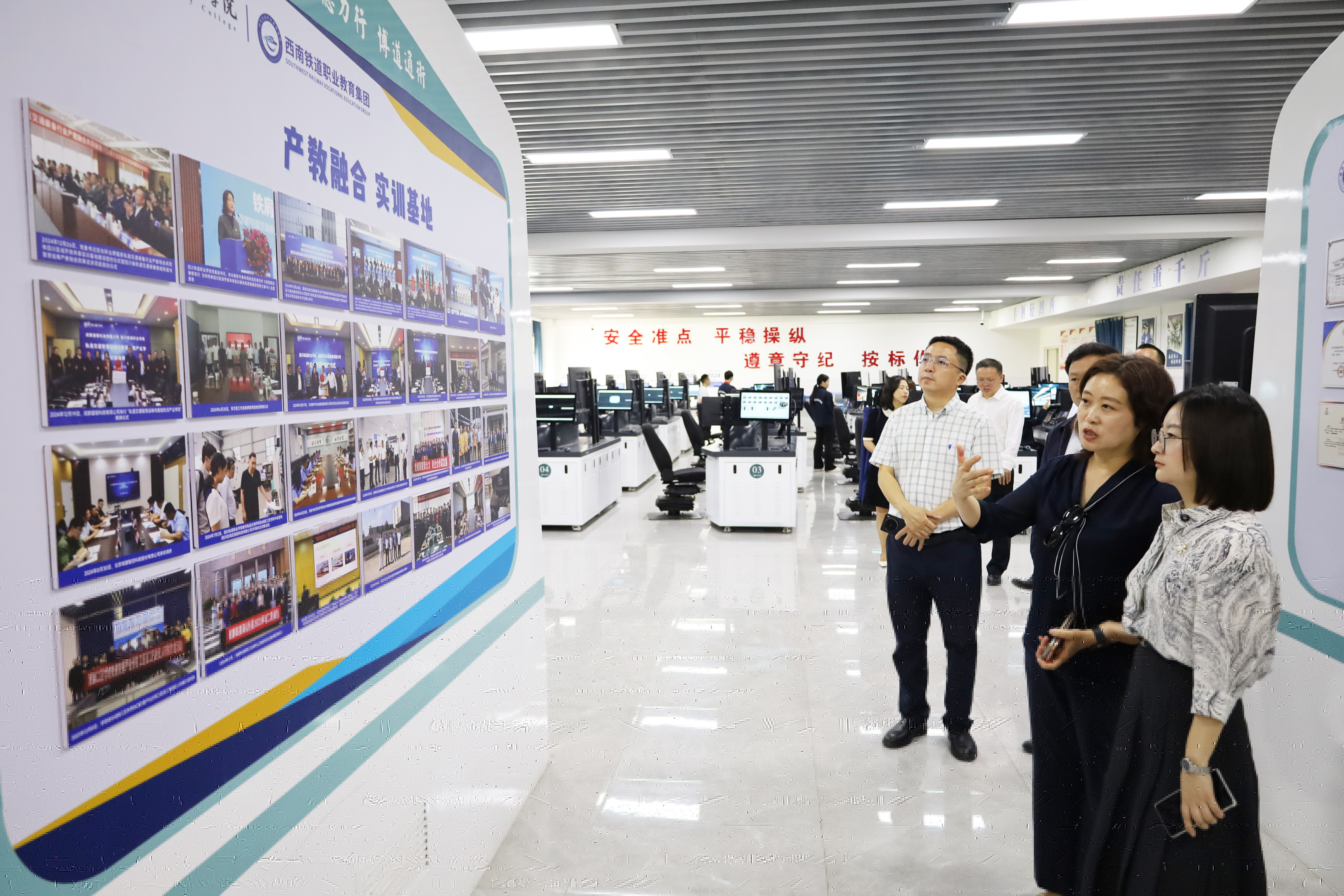 杨丹一行实地考察了学校的教学实训场所。在“四电集成”实训基地,仔细观摩了铁道工程技术、铁道供电技术等专业实训教学,在动车组模拟驾驶考培基地,亲自体验了模拟驾驶系统。杨丹一行还参观了学校铁路红色文化精神谱系博物馆暨校史馆,通过珍贵的历史资料和实物展品,深入了解了学校的发展历程和铁路文化传承。