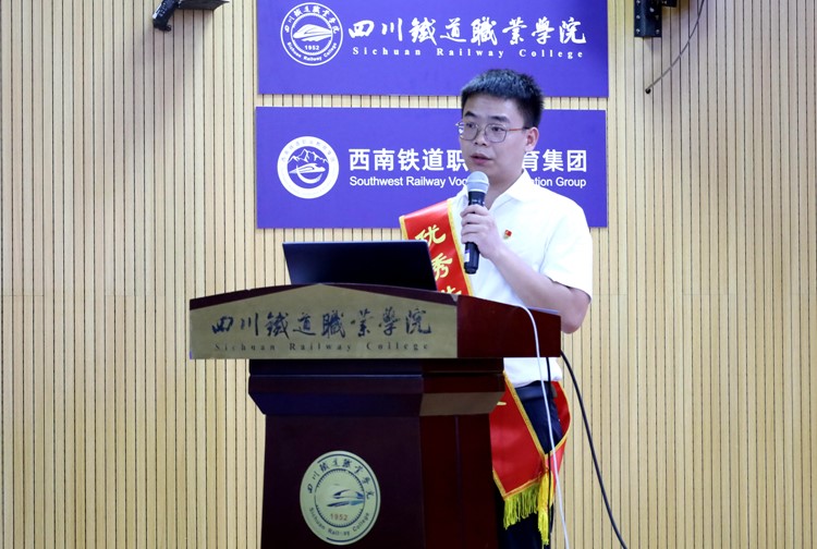 机车车辆学院教师黄翎峰代表受表彰的先进个人作了交流发言,他从以初心点亮轨道征程、以决心攻克技术难题、以匠心化作成长阶梯等方面分享了自己的职业经历、感想感悟,用朴实的语言诠释了共产党员的初心使命。