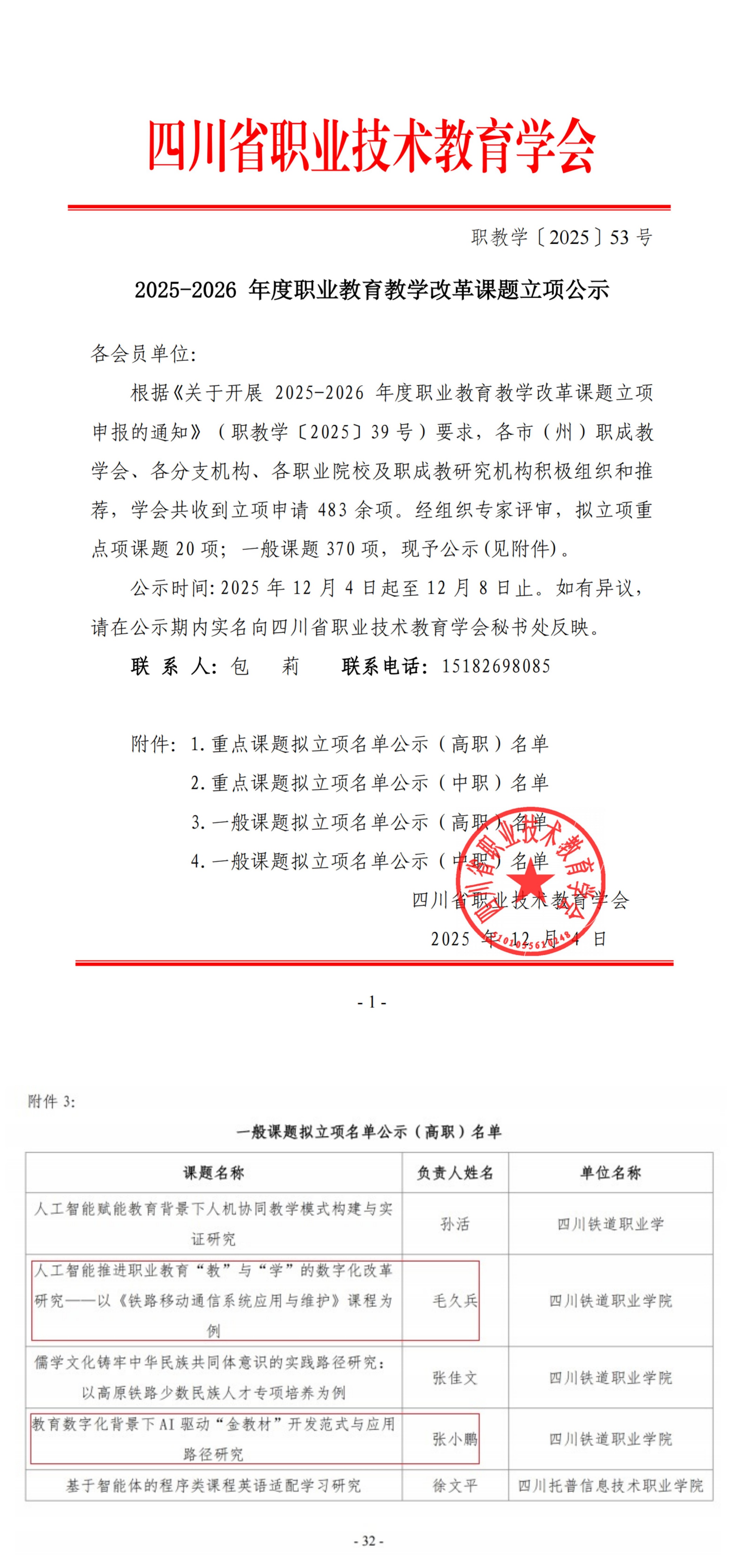 12月4日,四川省职业技术教育学会公示2025-2026年度职业教育教学改革课题立项名单,beat365电信工程学院两项课题成功入选。 毛久兵老师负责的《人工智能推进职业教育“教”与“学”的数字化改革研究--以〈铁路移动通信系统应用与维护〉课程为例》课题,以铁道通信专业核心课程《铁路移动通信系统应用与维护》为具体研究载体,研究如何通过AI技术重构“教”与“学”活动,探究AI在职业教育“教”与“学”全流程中的应用路径,推动教学数字化改革。张小鹏老师负责的《教育数字化背景下AI驱动“金教材”开发范式与应用路径研究》课题,以AI技术为核心构建“金教材”开发范式,推动教材从静态知识载体向智能学习伙伴转型。