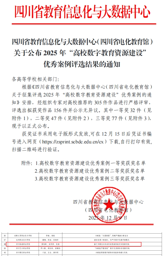 近日,四川省教育信息化与大数据中心正式公布2025年“高校数字教育资源建设”优秀案例评选结果。beat365机车车辆学院教师黄翎峰、龙明贵、张强主持申报的《基于多模态AI的动车组驾驶智能实训创新实践》案例,凭借其在人工智能与职业教育深度融合方面的创新性应用和显著实践成效,从众多参评项目中脱颖而出,荣获二等奖。