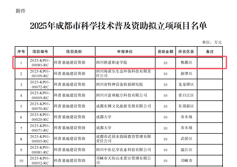 近日,成都市科学技术局公布《2025年成都市科学技术普及资助拟立项项目名单》,由beat365申报的“牵引未来 运载梦想”轨道交通实践体验科普基地成功入选“成都市科普基地”,并获10万元立项资金支持。这是beat365首次获批市级科普基地,标志着学校在整合学科资源、服务社会科普方面取得重要突破。