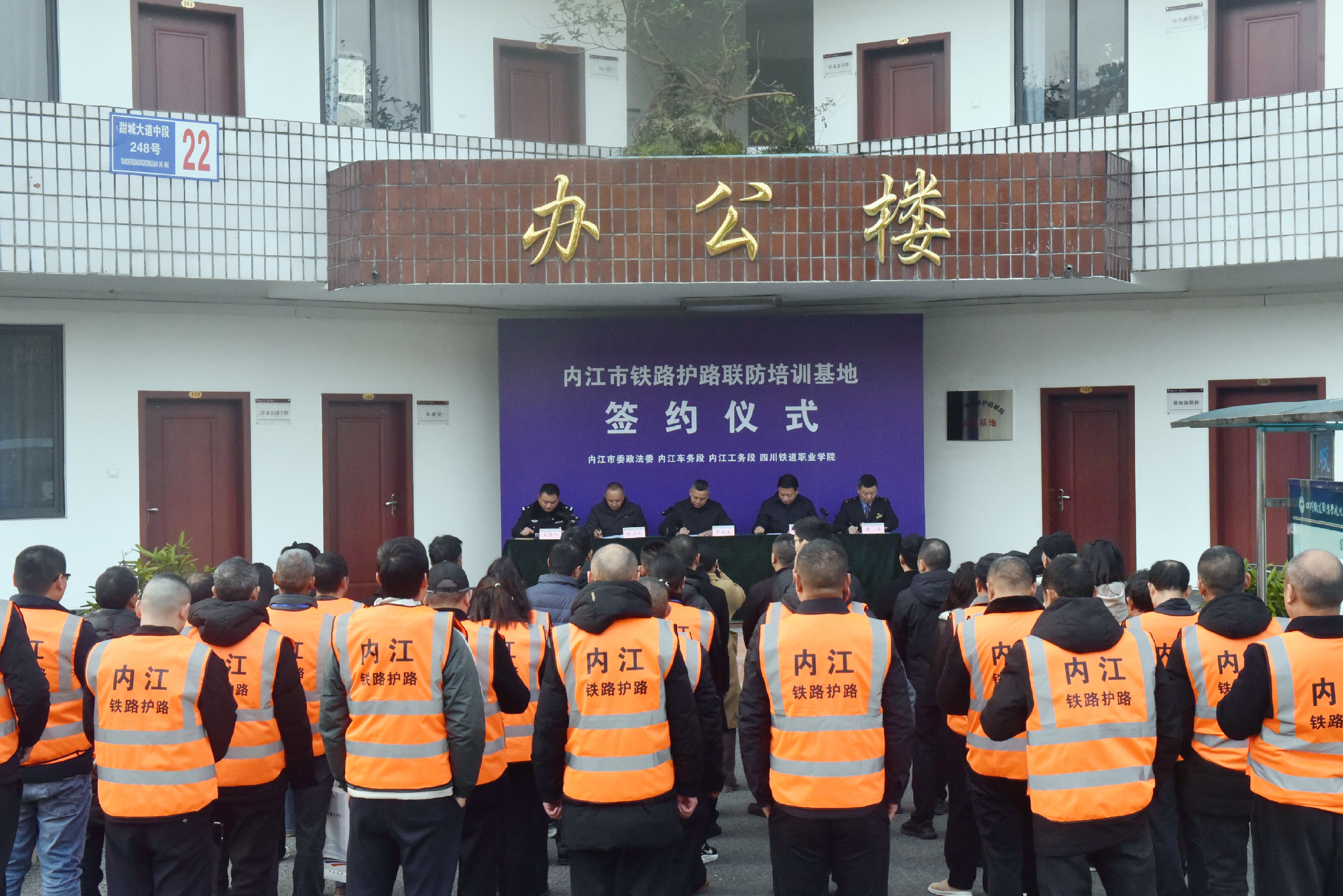 12月18日,内江市铁路护路联防培训基地签约仪式暨第一期培训班开班仪式在beat365英国官方网站内江校区隆重举行。市委政法委副书记、市铁路护路联防工作领导小组组长罗世友,学校副校长黄恩兴,中国铁路成都局集团有限公司内江车务段副段长黄涛、内江工务段副段长陈守义出席签约仪式。
