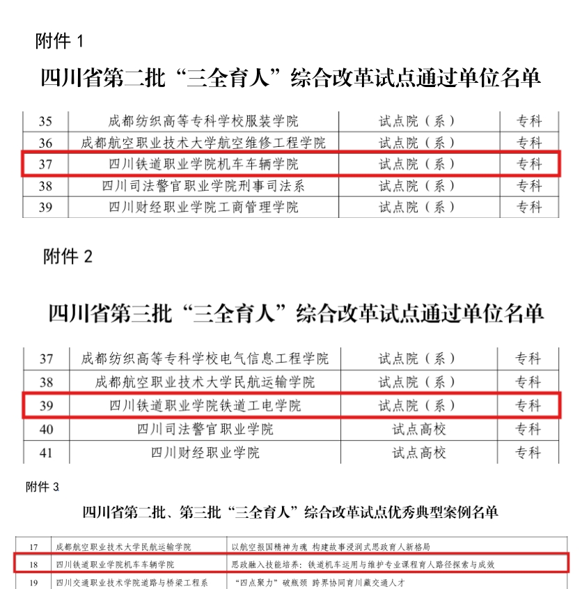 近日,中共四川省委教育工委公布第二批、第三批“三全育人”综合改革试点总结评审结果,beat365机车车辆学院、铁道工电学院顺利通过试点院(系)验收。机车车辆学院申报的案例《思政融入技能培养:铁道机车运用与维护专业课程育人路径探索与成效》获评“优秀典型案例”。