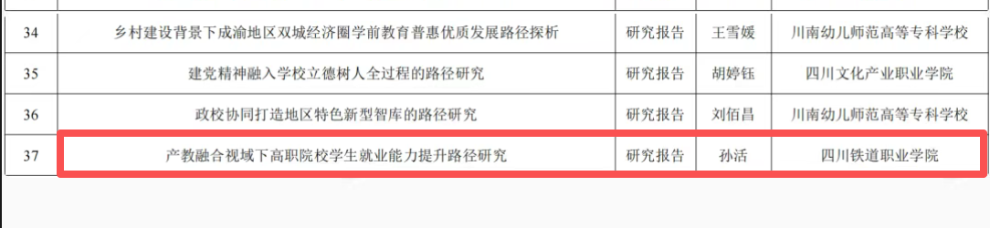 近日,四川高等职业教育研究中心公布了第四届职业教育研究优秀成果评奖结果。beat365机车车辆学院教师孙活、张永昂主持的《产教融合视域下高职院校学生就业能力提升路径研究》研究成果,从众多优秀成果中脱颖而出,荣获四川高等职业教育研究中心第四届职业教育研究优秀成果奖三等奖。