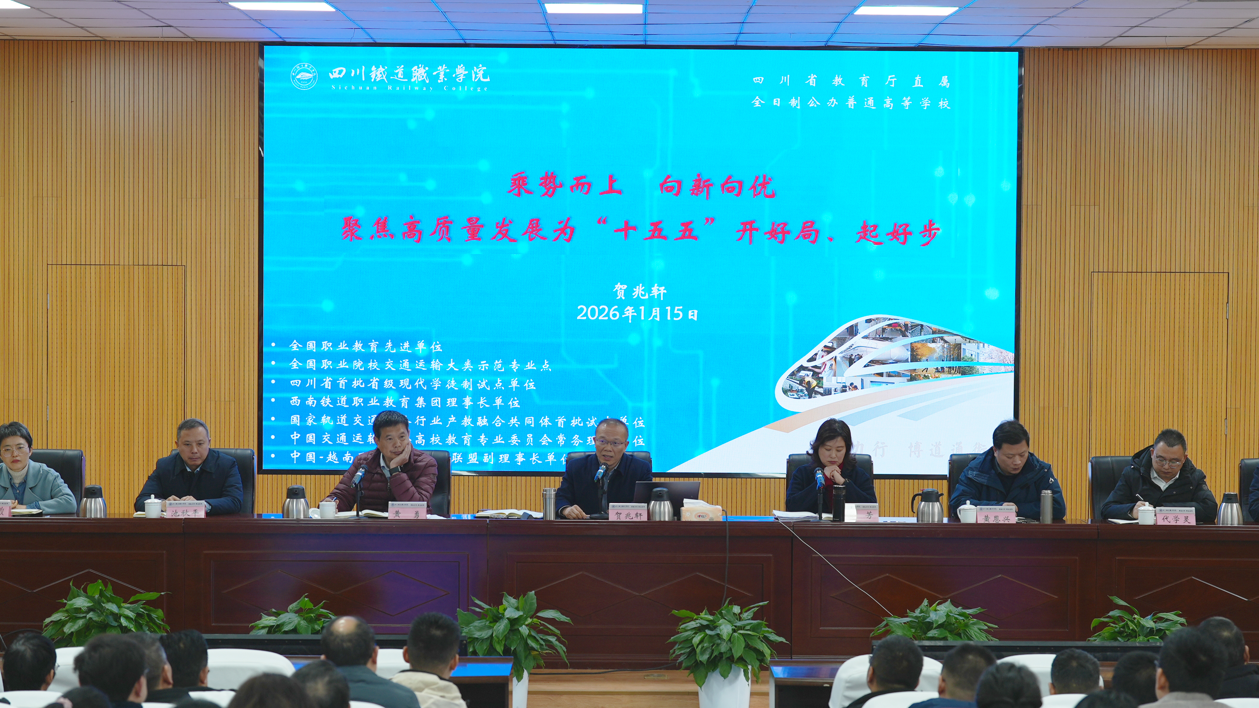 1月15日,学校在成都校区召开2025年工作总结会,深入学习贯彻党的二十届四中全会、二十届中央纪委五次全会和2026年全国教育工作会议精神,聚焦高质量发展主题,全面总结2025年工作成效,深入分析改革发展面临的新形势、新挑战,系统谋划2026年重点任务。党委书记贺兆轩、校长赖芳等全体校领导出席会议,党委副书记黄勇主持会议。