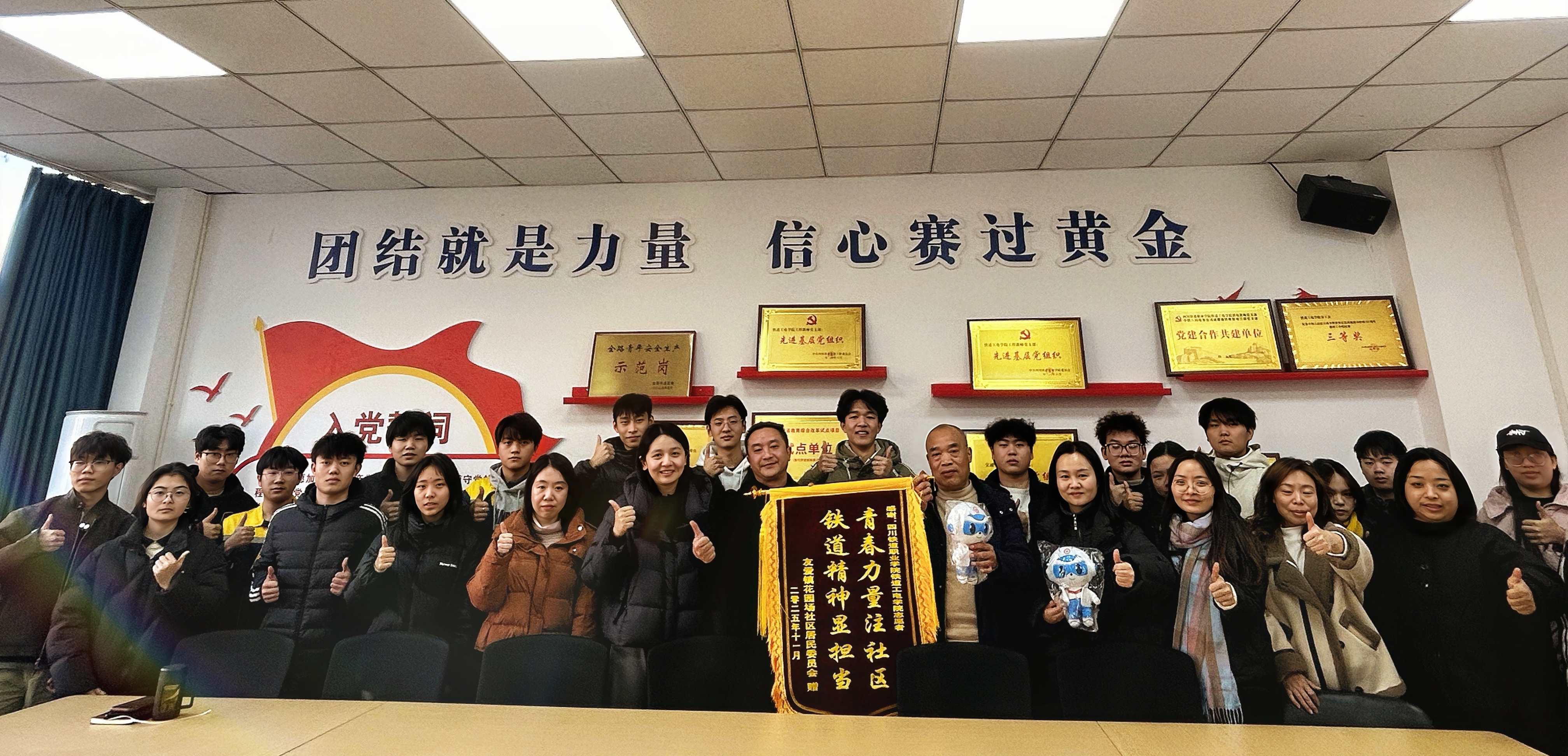 为深化校社协同育人机制,凝聚实践育人合力,2026年1月8日,成都市郫都区友爱镇花园场社区书记李忠毛、副书记张敏携社区工作人员一行,专程赴beat365英国官方网站铁道工电学院,为学院在暑期“三下乡”社会实践中表现突出的“川心向党 薪火相传志愿服务宣讲团”与“融绿 筑憩实践志愿服务队”授予锦旗与志愿者荣誉证书。授旗颁奖仪式于学院第二教学楼2404会议室举行,铁道工电学院党总支副书记董浩、专职辅导员董衡、余雅莉及两支实践队伍全体成员共同出席。