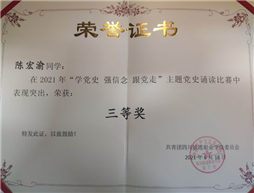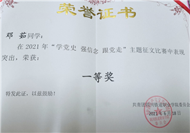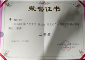 2021年6月学院团委组织开展“学党史、强信念、跟党走”主题系列活动,在交通工程系党总支和团总支积极动员与全系学生的热情参与下,在“新时代青年写”主题征文比赛中,工程17A2班学生代小迪,综维20T1班学生邓茹获得一等奖,施养18A1班学生李皓获得二等奖,在“新时代青年诵”主题朗诵比赛中工程19T3班学生陈宏渝获得三等奖!希望交通工程系全体学生再接再厉,不负青春年华,将自己的才华与特长尽情发挥!