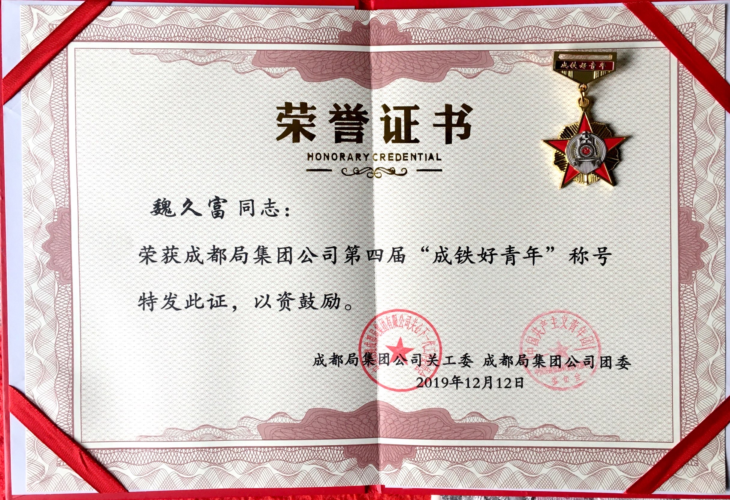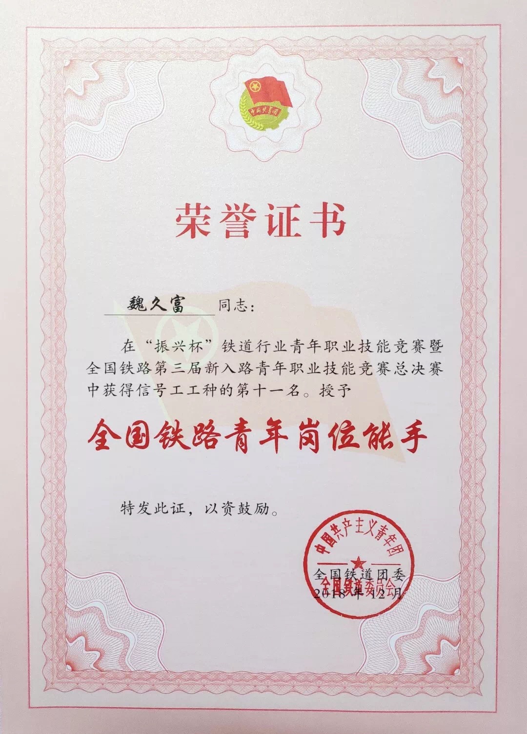 魏久富,男,1993年3月出生,中共预备党员,大专学历。2014年6月毕业于电信工程系铁道通信信号专业,同年7月分配到重庆电务段工作,现任生产调度室助理工程师,段专家站骨干成员。2017年总公司第五届全国铁道行业职业技能大赛道岔组第十六名、2018年“振兴杯”铁道行业青年职业技能竞赛暨全国铁路第三届新入路青年职业技能竞赛铁路信号工工种第十一名、第七届全局暨第三届川渝黔三地铁道行业职业技能大赛信号工(车站与区间信号)工种决赛第二名。先后授予“全国青年岗位能手”、“全路青年岗位能手”、“全路技术能手”、“全局技术能手”、“尼红式奖章”、“成铁好青年”、“集团公司十大青年标兵”等荣誉称号,重庆电务段道岔电路专家,擅长分析各类道岔电路疑难故障。