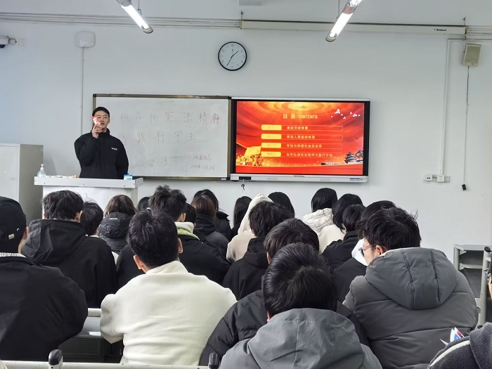 宪润心田,强化法治观念教育。各班组织开展了“弘扬宪法精神——学法人人受益,守法处处和谐”主题团课,通过课件讲解、视频展示、互动问答与小组讨论等多元化形式,引导学生深入思考宪法日的设立背景、学法对个人成长的益处、守法与构建和谐社会的紧密联系,以及如何在日常生活中弘扬宪法精神、践行守法行为等重要议题,进一步强化了学生的法治观念与责任担当。