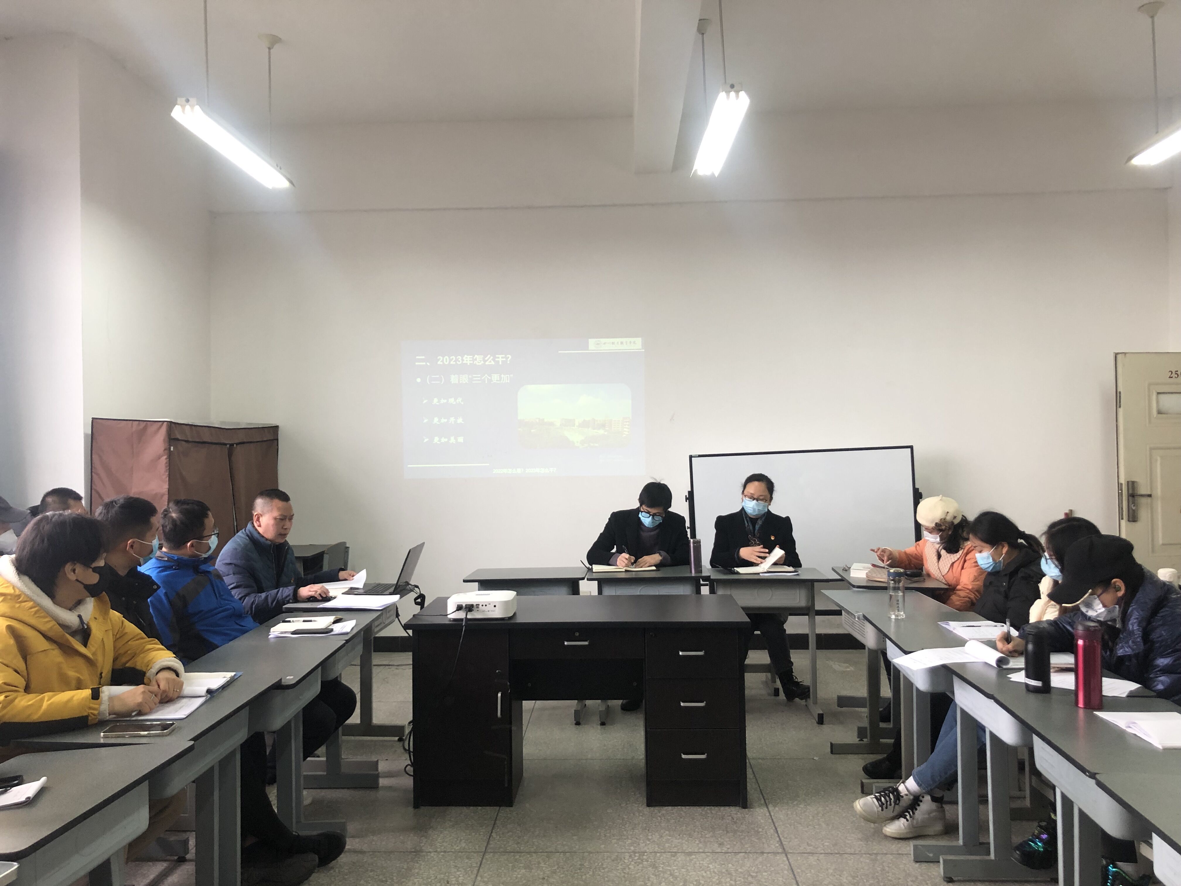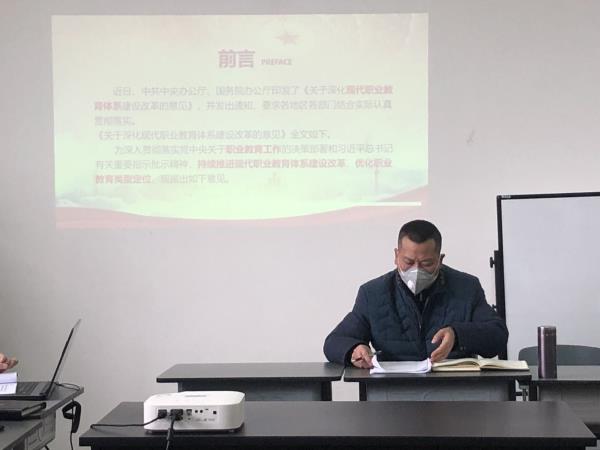 为认真贯彻落实《关于深化现代职业教育体系建设改革的意见》等文件精神,根据《中共beat365英国官方网站委员会关于深入学习宣传贯彻党的二十大精神工作方案》要求,2023年1月9日,公共教学部组织召开《关于深化现代职业教育体系建设改革的意见》专题学习会暨寒假工作部署会。公共教学部全体教师参加了本次会议。