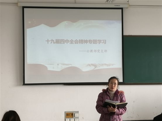 为深入学习贯彻党的十九届四中全会精神,让全会精神入脑入心,增强支部教师的实干精神,12月23日公共教学党支部在2521教室开展集中学习活动。支部书记颜静同志从会议的意义、会议关键词及会议内容方面,用通俗易懂、生动形象的语言讲党课,分享她学习十九届四中全会的体会。