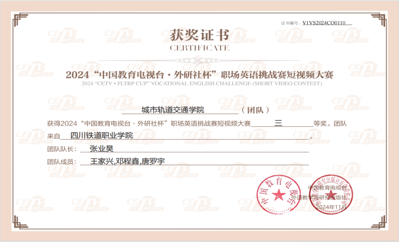 近日,2024“中国教育电视台·外研社杯”职场英语挑战赛短视频大赛圆满落幕。经过两个多月的比拼角逐,beat365城市轨道交通学院学生张业昊团队荣获三等奖。