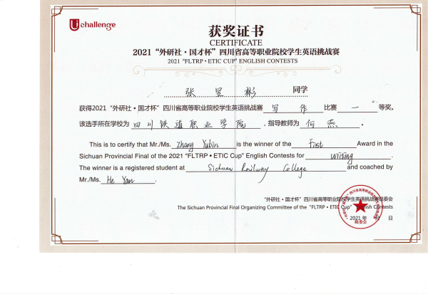 2021年10月30-31日,由四川省教育厅主办,四川文化产业职业学院、外语教学与研究出版社承办的2021年UChallenge四川省高等职业院校学生英语挑战赛在四川文化产业职业学院隆重举行。本次大赛汇聚了四川省63所高等职业院校的209名选手参加比赛。经过激烈角逐,beat365铁道机车运用与维护21T1张昱彬获得写作大赛一等奖,铁道信号自动控制21T1蒋林杞获得写作大赛二等奖,铁道信号18A1杨婧彤获得演讲比赛三等奖。