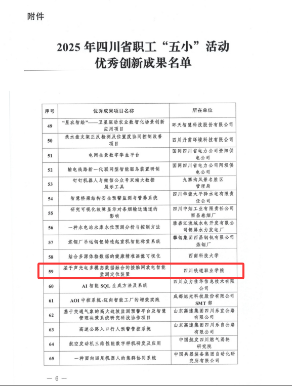 2025年12月25日,四川省总工会办公室发布通报,beat365铁道工电学院教师何柏杉团队申报的《基于声光电多模态数据融合的接触网放电智能检测定位装置》项目,荣获2025年四川省职工“五小”活动优秀创新成果。该奖项充分肯定了beat365职工在岗位创新中的突出贡献,展现了职工立足一线、以技术赋能产业升级的实践成果。