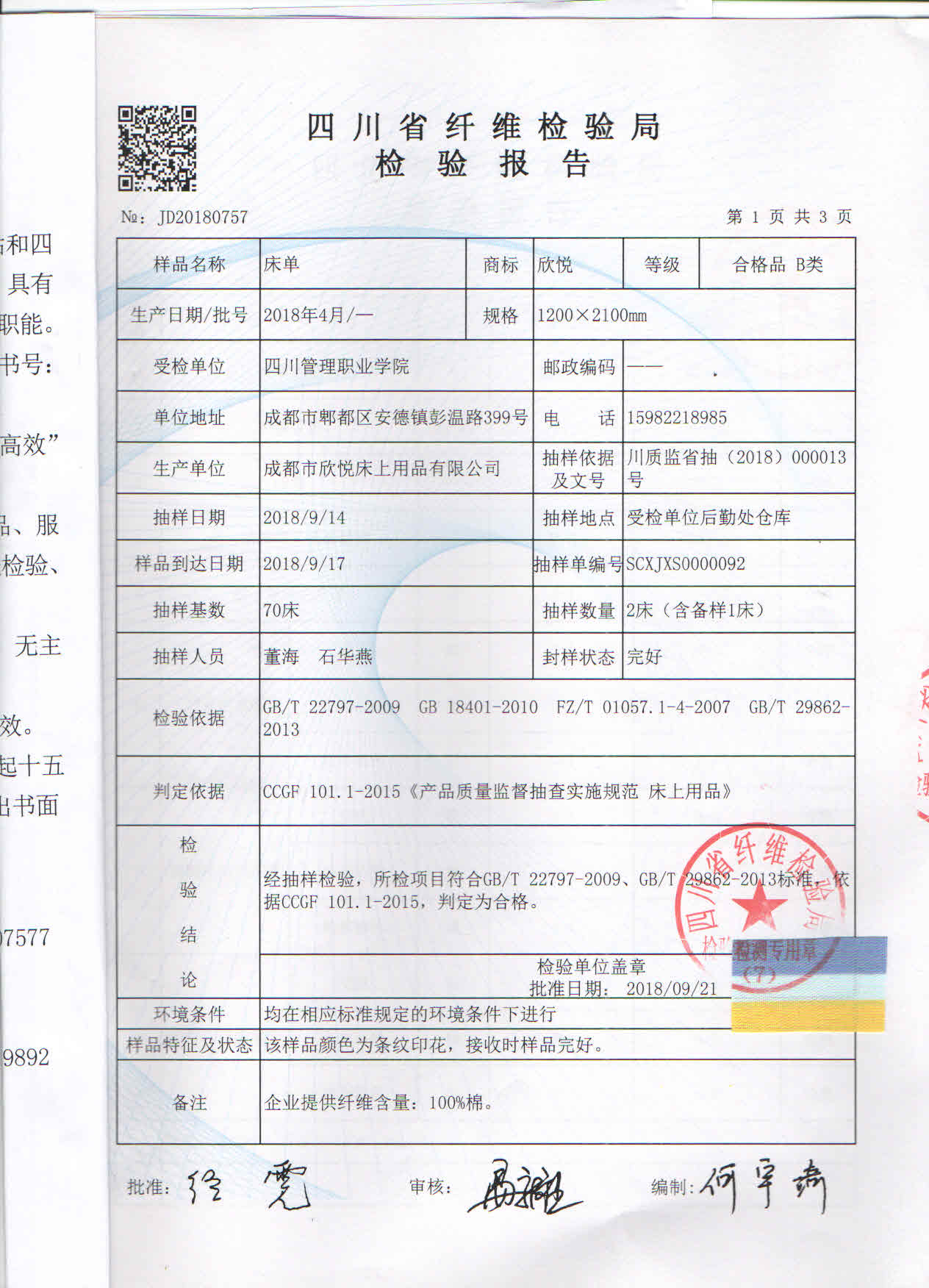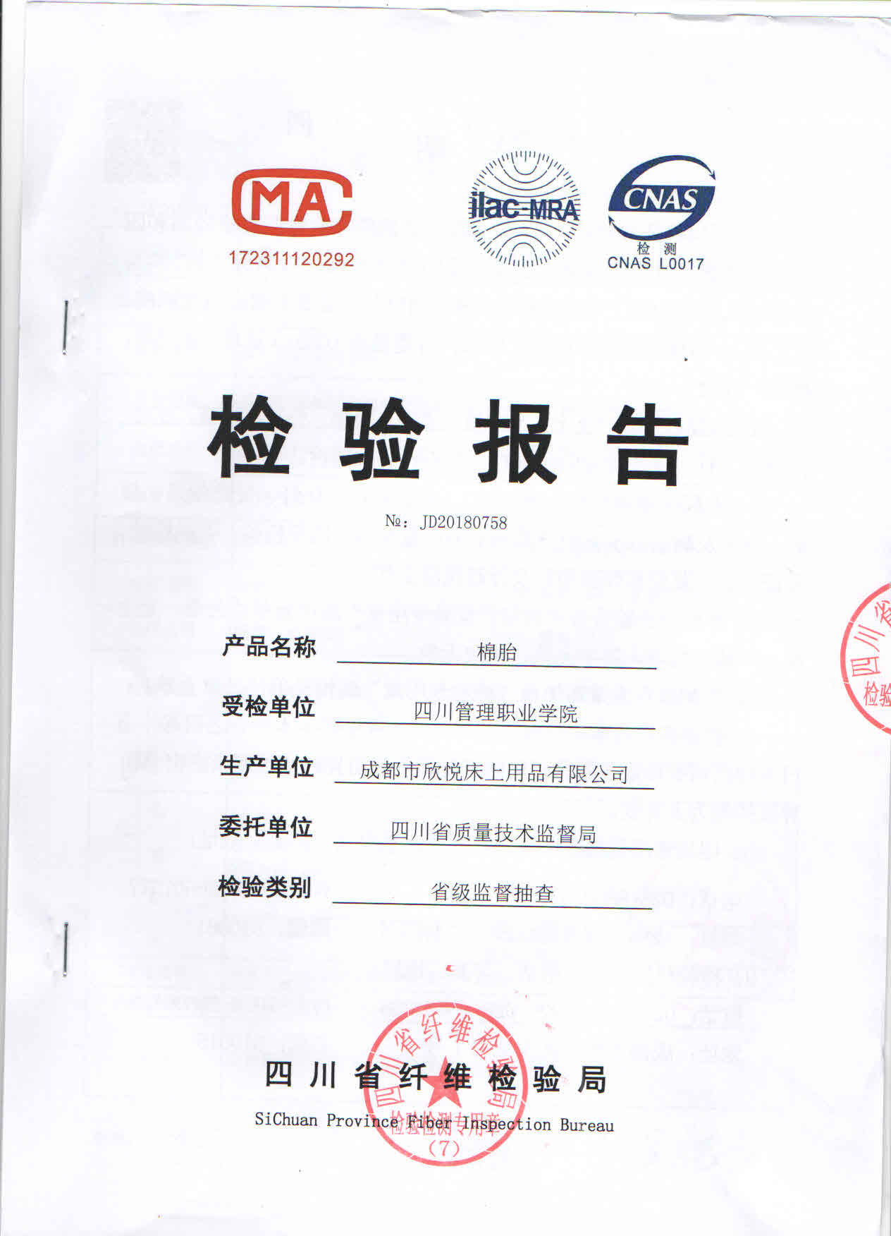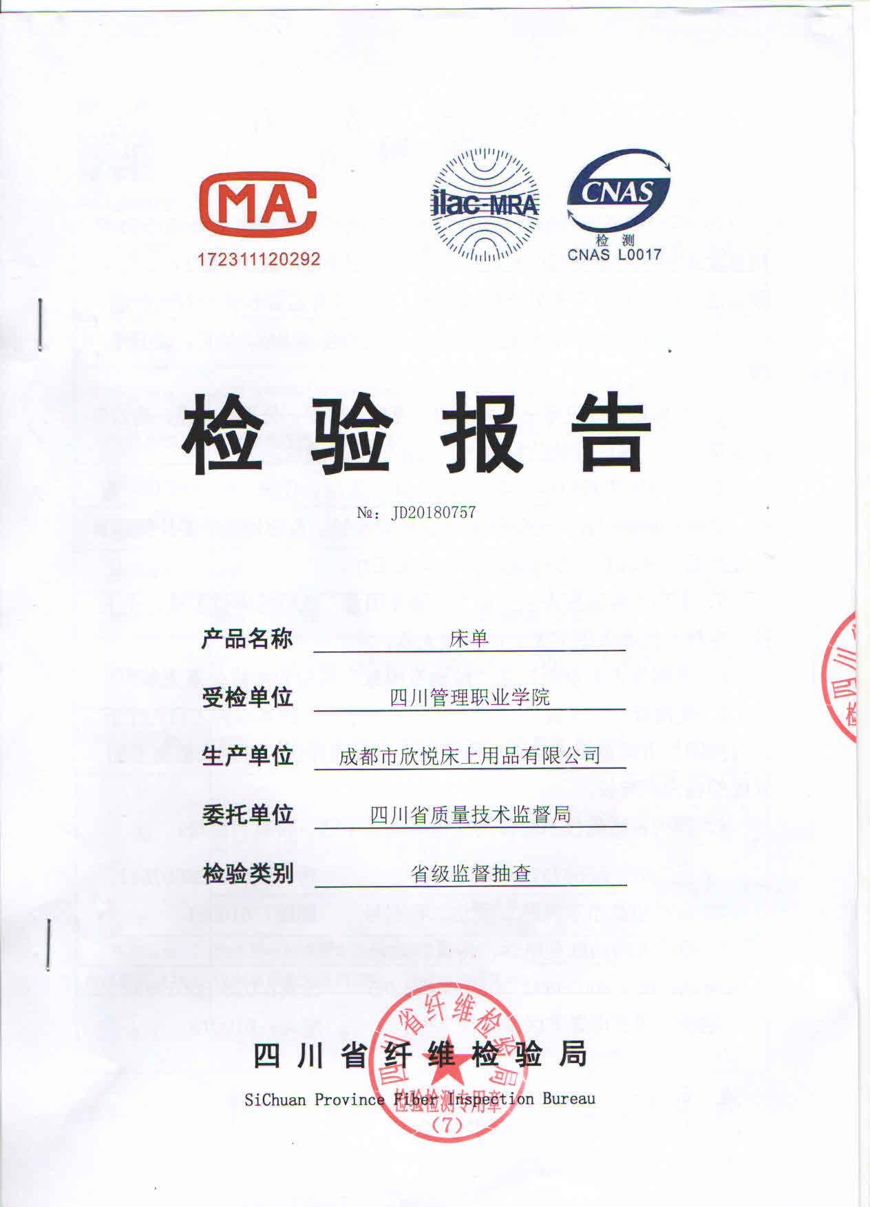 2018年四川管理职业学院新生床上用品检测报告