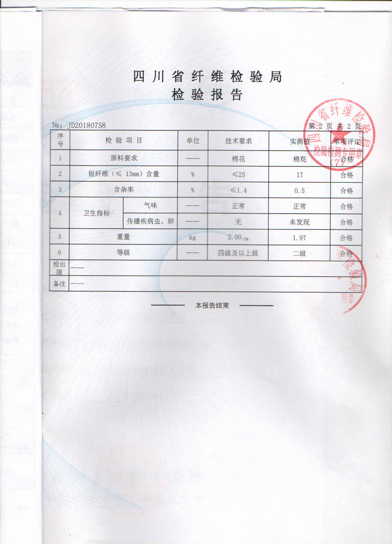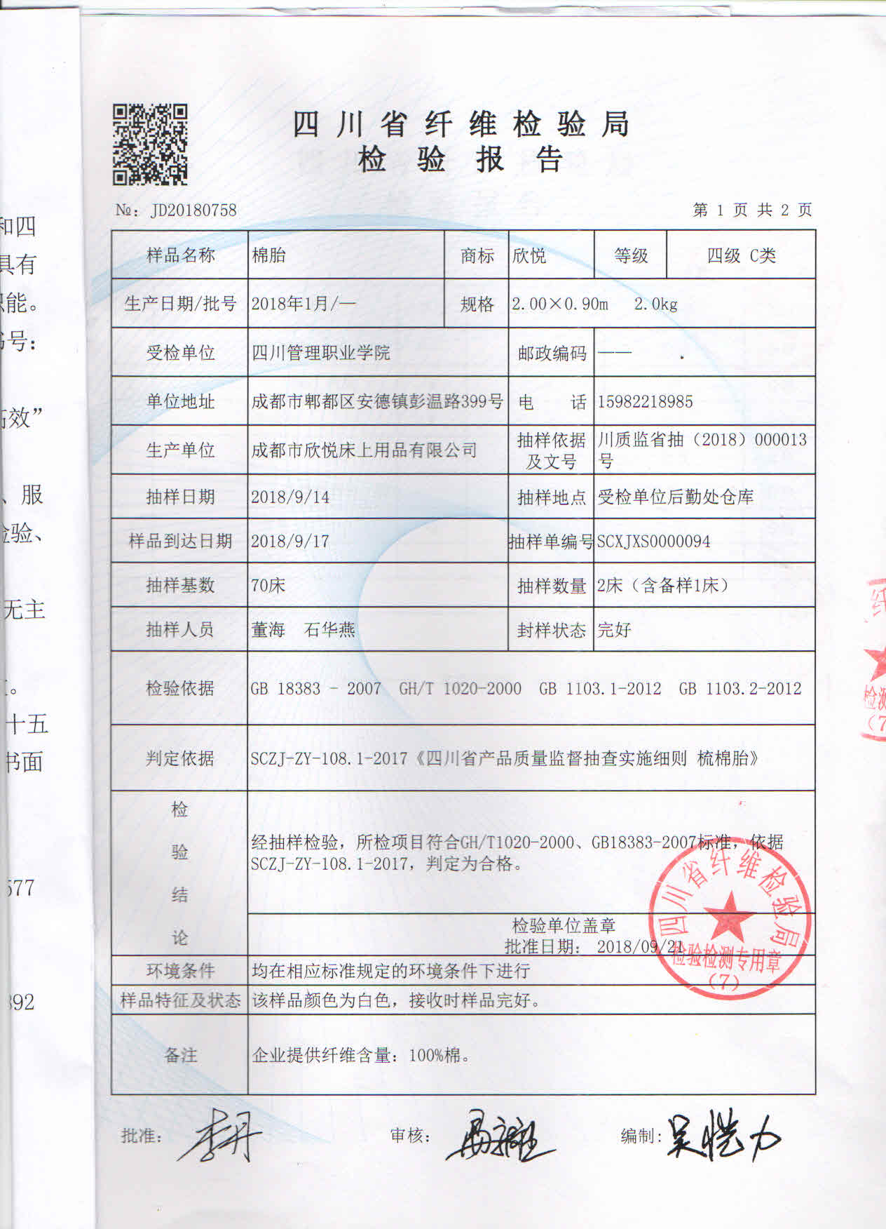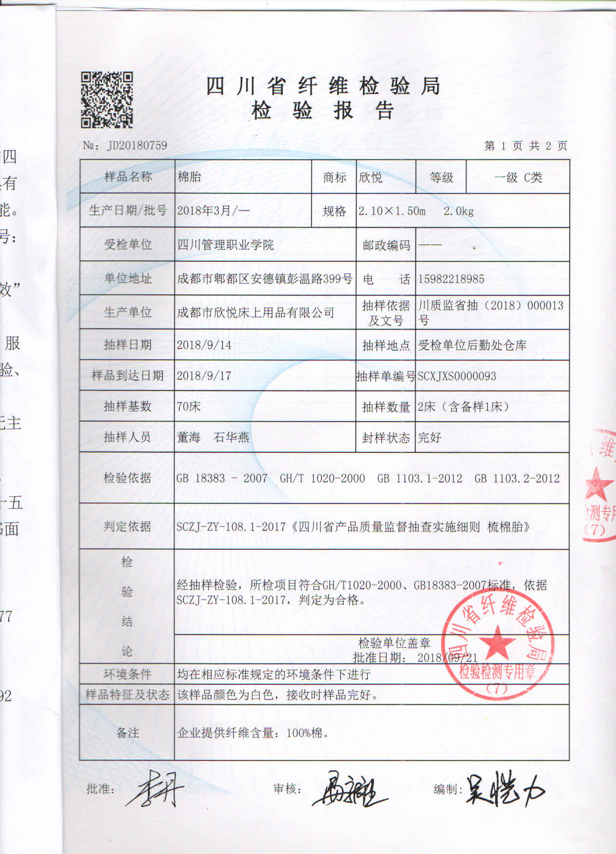 2018年四川管理职业学院新生床上用品检测报告