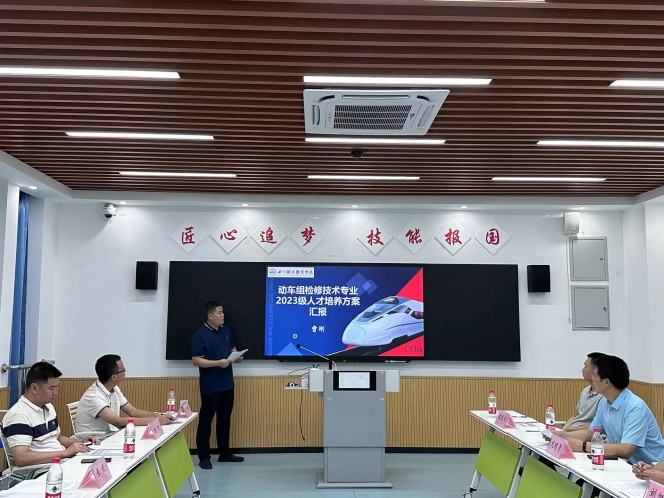 动车组检修技术专业教研室主任曹刚与铁道车辆技术专业教研室主任翁玉鸣就2023级人才培养方案、专业调研情况及专业建设现状和方案进行汇报。与会专家认真听取了报告,对人才培养方案给予充分肯定的同时,提出切实可行的修订意见。会上,校企双方一致表示将以“2+1”定向培养为契机,将职业培训内容融入教学体系,强化铁路安全技术规章、岗位作业标准和应急处理等业务知识培养,促进专业设置精准对接当前产业结构转型升级的发展需求,培养适应社会发展的高质量人才。