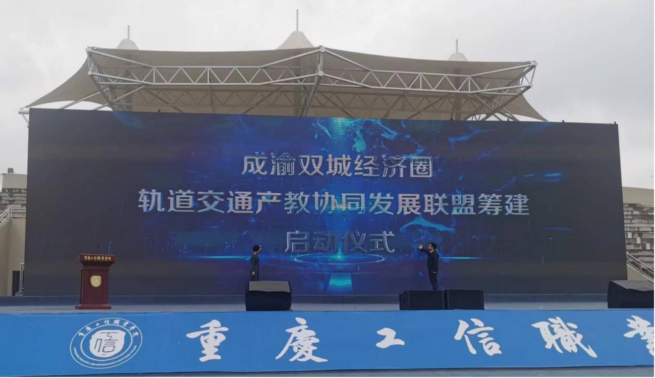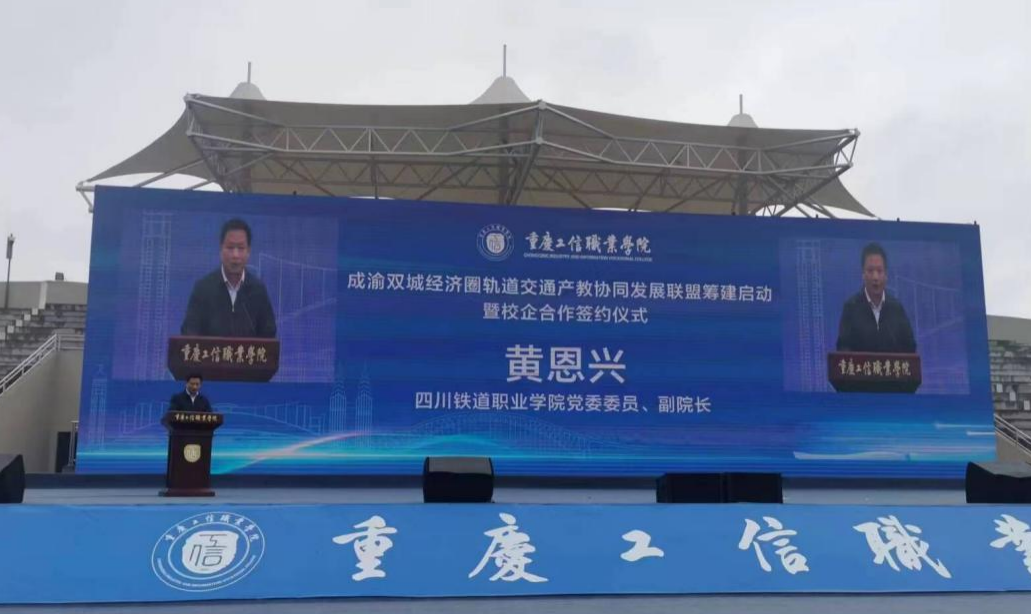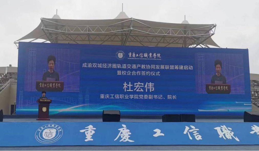 重庆工信职业学院党委副书记、院长杜宏伟与学校党委委员、副院长黄恩兴共同为成渝双城经济圈轨道交通产教协同发展联盟筹建启动仪式揭牌。
