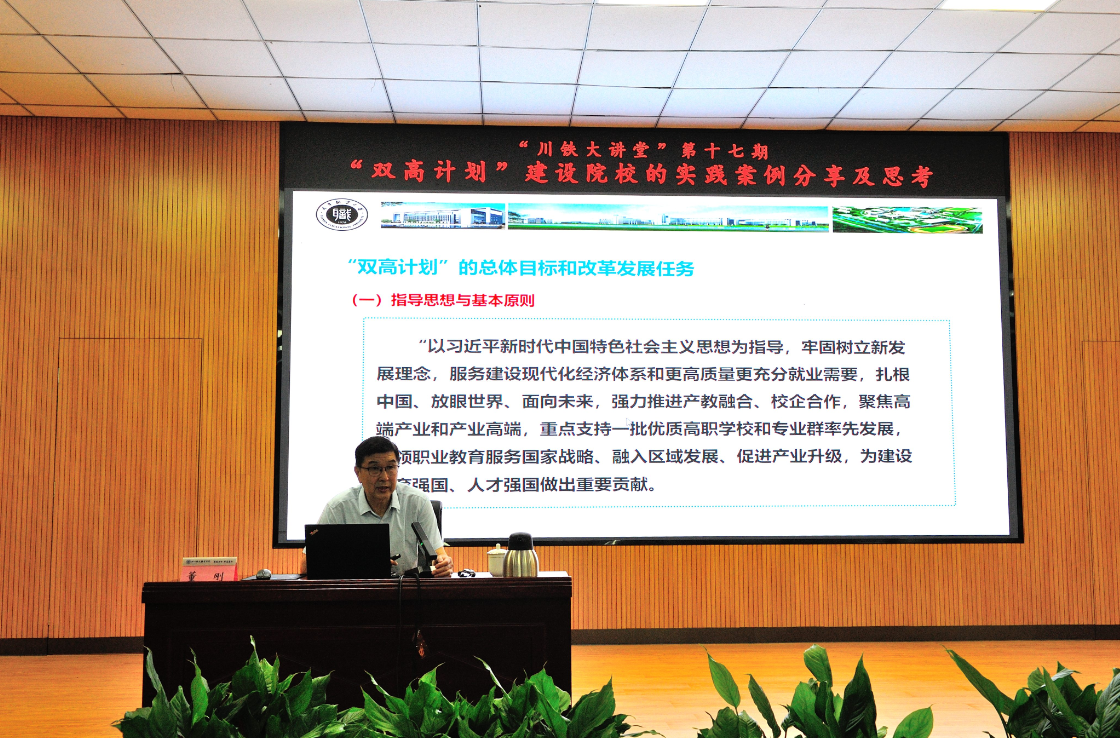 8月18日上午,“川铁大讲堂”第十七期在学校学术报告厅举行。本期大讲堂特邀天津职业大学原校长,全国高等职业学校校长联席会议主席董刚教授,到校作了题为《“双高计划”建设院校的实践案例分享及思考》的讲座。