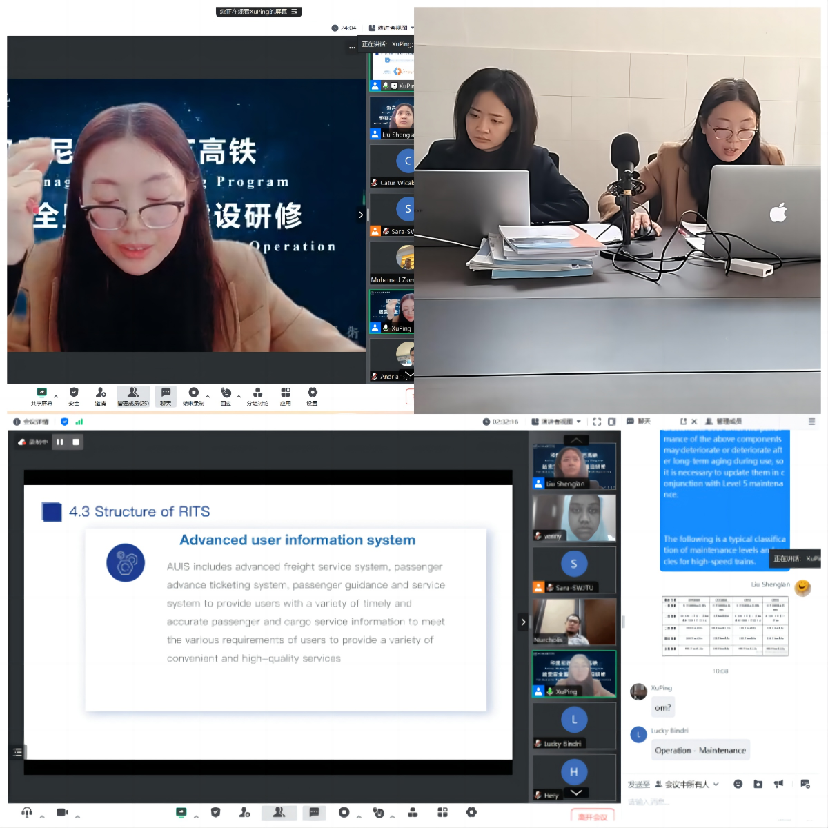 12月7日上午,beat365教师刘盛蓝、徐萍受邀为西南交大主办的印度尼西亚雅万高铁运营安全监督能力建设研修班讲授《高铁运营安全管理》课程。此次研修班主要针对印度尼西亚交通部铁路局、铁路局安全处、印度尼西亚铁路理工学院的官员开展,旨在提升印尼雅万高铁运营安全及管理效率,加强中印尼两国在高速铁路领域的交流与合作。
