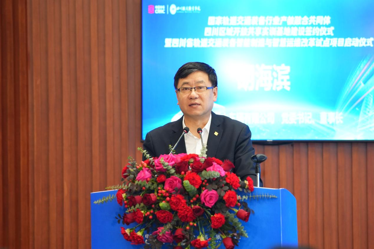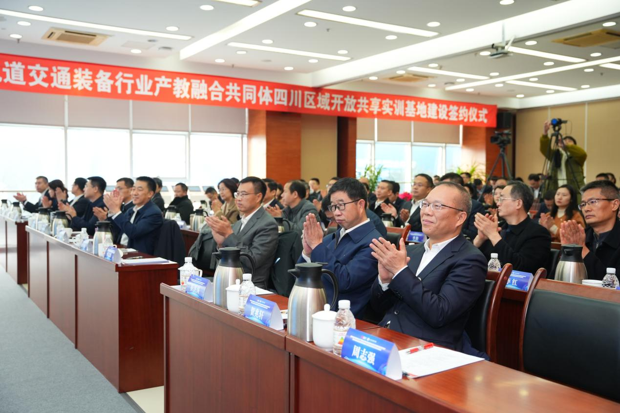 中国中车集团有限公司党委委员、工会主席赵虎出席活动并讲话。他指出,共享基地通过整合中车地方企业的职业教育资源,充分发挥地方高校人才培养与科学研究优势,打造了一系列开放共享的实训基地,这必将成为连接政府、企业、院校的桥梁纽带,推动地方产业和教育资源共享、优势互补、协同发展,优化人才培养结构,提升技术创新能力,为轨道交通装备行业的转型升级提供更坚实的人才保障和智力支持。此次国家轨道交通装备行业产教融合共同体四川区域开放共享实训基地建设签约仪式的举行,对于深化校企合作,促进教育链、人才链与产业链、创新链的有机衔接,具有重要的里程碑意义。他希望四川区域开放共享实训基地建设:一是要打造赓续红色基因、传承红色文化的 “示范校”;二是要打造轨道交通装备行业原创技术的 “策源地”;三是要打造轨道交通装备行业科技人才的 “孵化园”;四是要打造推进形成新质生产力的 “动车头”。