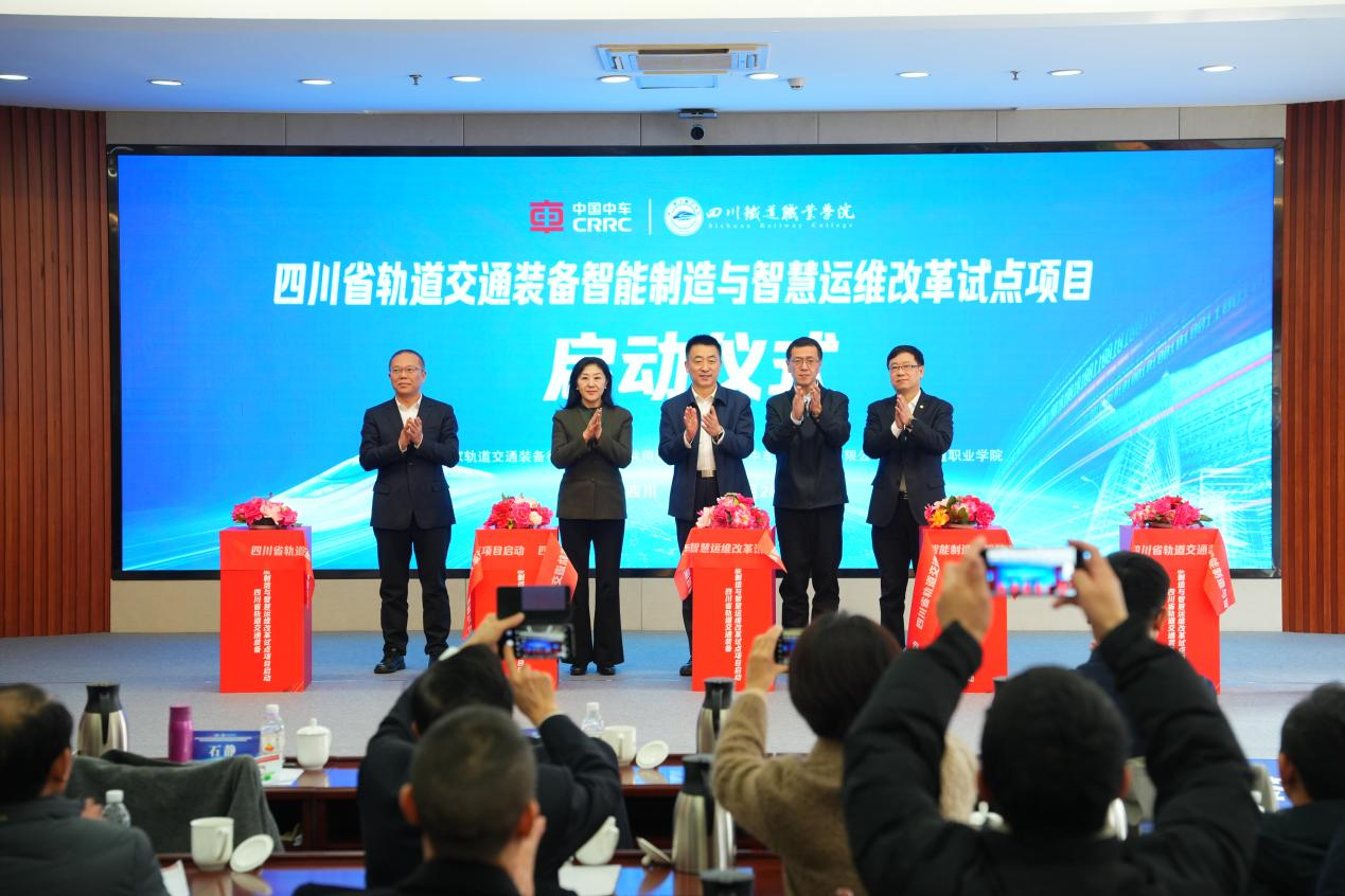 中国中车集团有限公司党委委员、工会主席赵虎,中共四川省委教育工委委员、教育厅党组成员、副厅长石静,眉山市人民政府党组成员、副市长田一澍,beat365英国官方网站党委书记贺兆轩,中车眉山车辆有限公司党委书记、董事长胡海滨共同为四川省轨道交通装备智能制造与智慧运维产教融合改革试点项目正式启动剪彩。